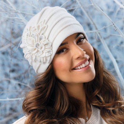 Bílá zimní čepice z nejkvalitnější vlny s certifikátem Woolmark quality, která se dokonale přizpůsobí každé velikosti hlavy. Dámská čepice skvěle padne a je precizně propracovaná, zdobená ručně nápaditou květinovou aplikací, která čepici dodává jedinečný vzhled. Naše zimní dámské čepice vás zahřejí a zároveň jsou velice slušivé a komfortní.