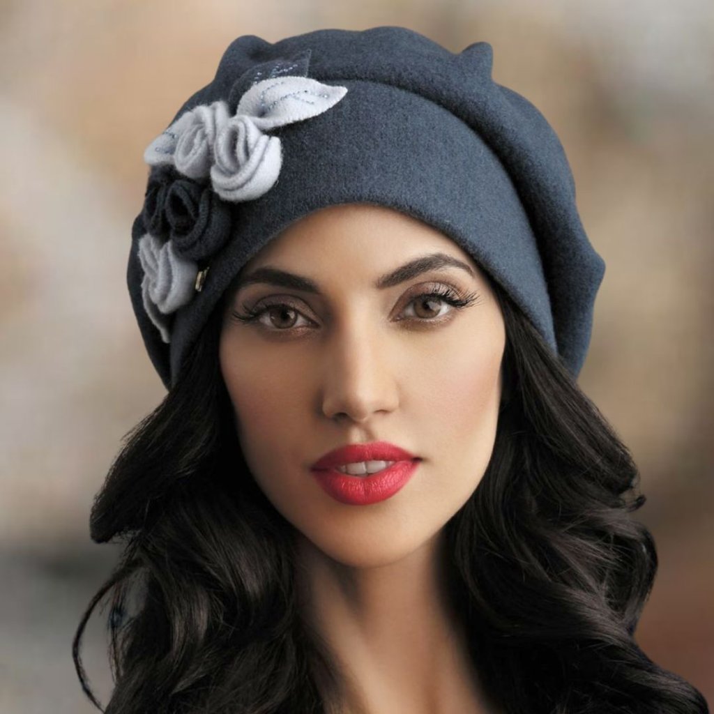 Elegantní dámská čepice baretového střihu je vyrobená ze 100% certifikované vlny Woolmark quality. Modrý baret zdobí vlněné květy s lístky v tónu barvy vlny. Vlna je velmi měkká, díky čemuž se výrobek dokonale přizpůsobí velikosti hlavy.