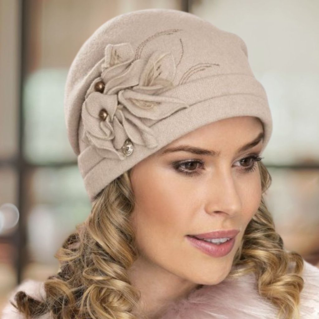Dámská elegantní vlněná béžová čepice s originální ručně tvořenou aplikací v dokonale barevně ladících tónech. Béžová dámská čepice má krásný propracovaný střih, který je vzadu stažený do sámku.
