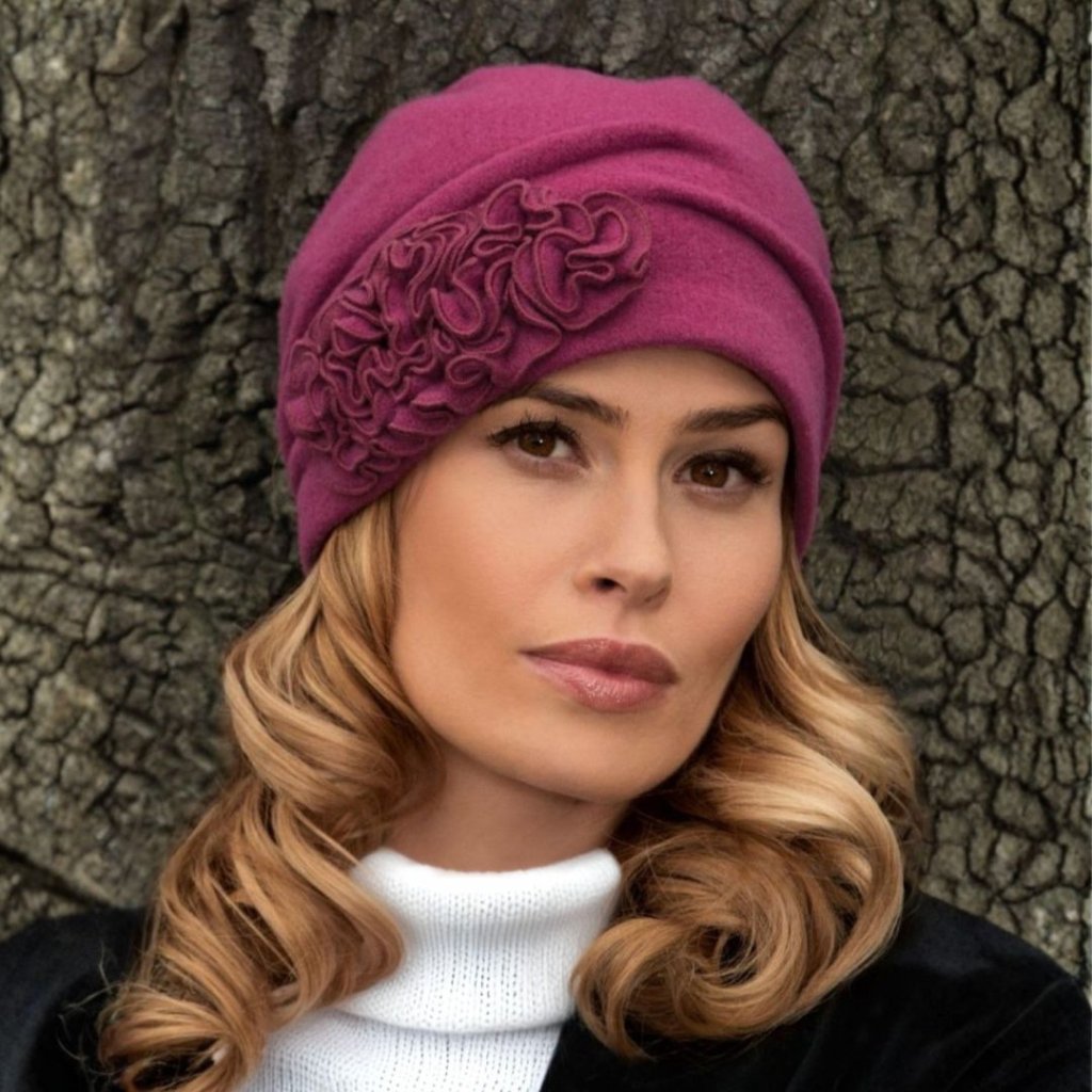 Elegantní vlněná čepice slušivého střihu. Povrch čepice je zdoben aplikací z vlny a sámky, které jí dodávají jedinečný charakter. Díky měkké vlně se výrobek přizpůsobí každé velikosti hlavy. Stylový kousek, který oceníte při každodenním nošení i při zimních procházkách městem. Skvěle doplní kabát, šálu i váš osobní zimní styl a pohodlně, žensky a s vkusem.