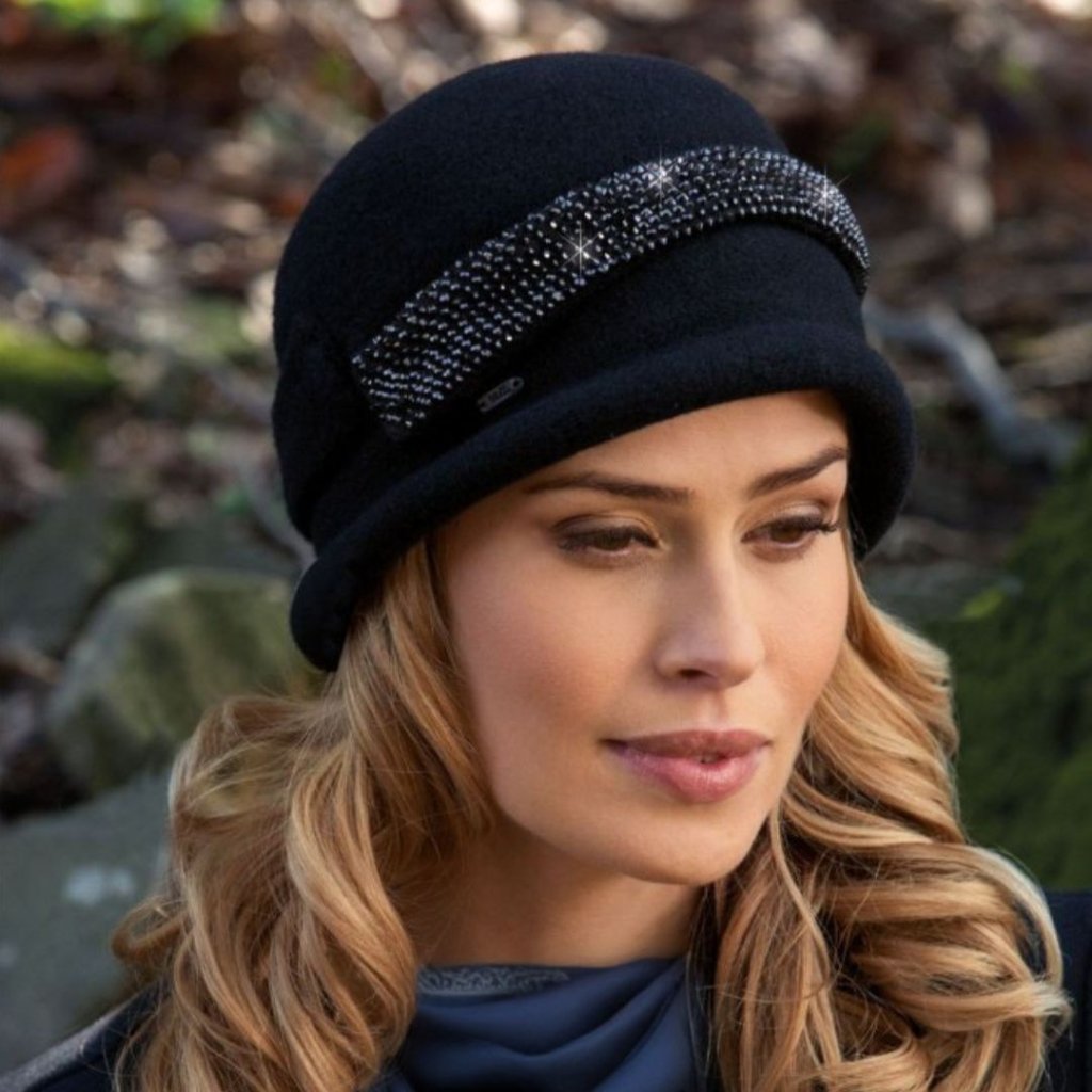 Elegantní čepice s kulatým lemem z certifikované vlny české výroby, zdobená páskem s kamínky stejné barvy. Vlna je velmi měkká, díky čemuž se výrobek dokonale přizpůsobí velikosti hlavy.