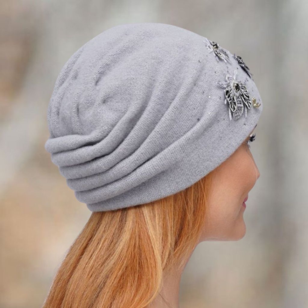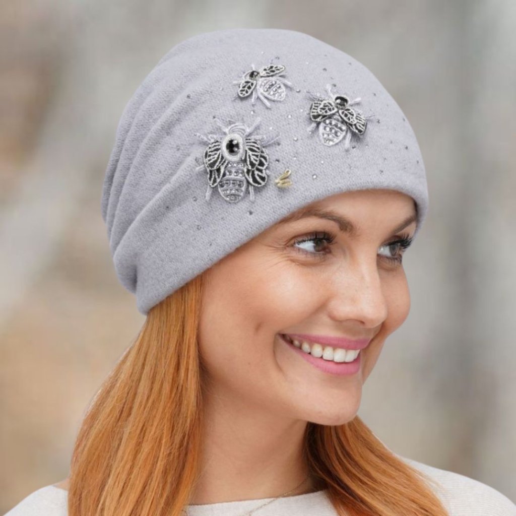 Jedinečná šedá zimní čepice nejkvalitnější vlny s certifikátem Woolmark, která se dokonale přizpůsobí každé velikosti hlavy. Elegantní světle šedá čepice má originální charakter, který jí dodává lehce třpytivá aplikace tvořená včelkami, perličkami a třpytivými krystaly. Čepice má velmi slušivý a propracovaný střih, který je na temeni hlavy stažený do sámků. Top model, který lehce doladíte k zimnímu kabátku nebo bundičce.