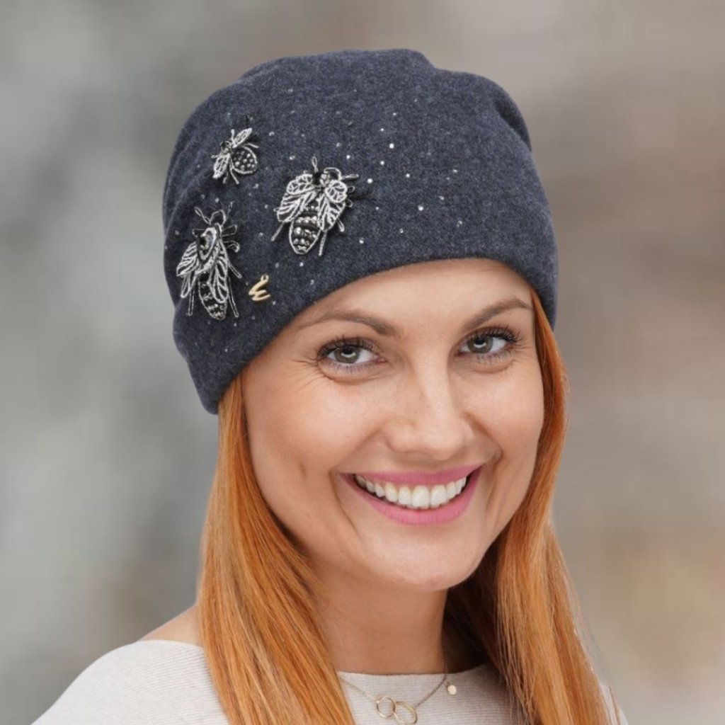 Jedinečná antracitová zimní čepice nejkvalitnější vlny s certifikátem Woolmark quality, která se dokonale přizpůsobí každé velikosti hlavy. Elegantní šedá čepice má originální charakter, který jí dodává lehce třpytivá aplikace tvořená včelkami, perličkami a třpytivými krystaly. Čepice má velmi slušivý a propracovaný střih, který je na temeni hlavy stažený do sámků. Top model, který lehce doladíte k zimnímu kabátku nebo bundičce.