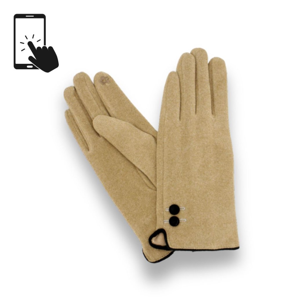 Jemné dámské béžové a velmi pružné pohodlné rukavice s podšívkou z mikroplyše jsou z vrchní části zdobené černými knoflíčky a černě lemované. Čímž vypadají rukavice velmi elegantně. Navíc mají dva prsty s bodem, který je určen na ovládání dotykového mobilu.
