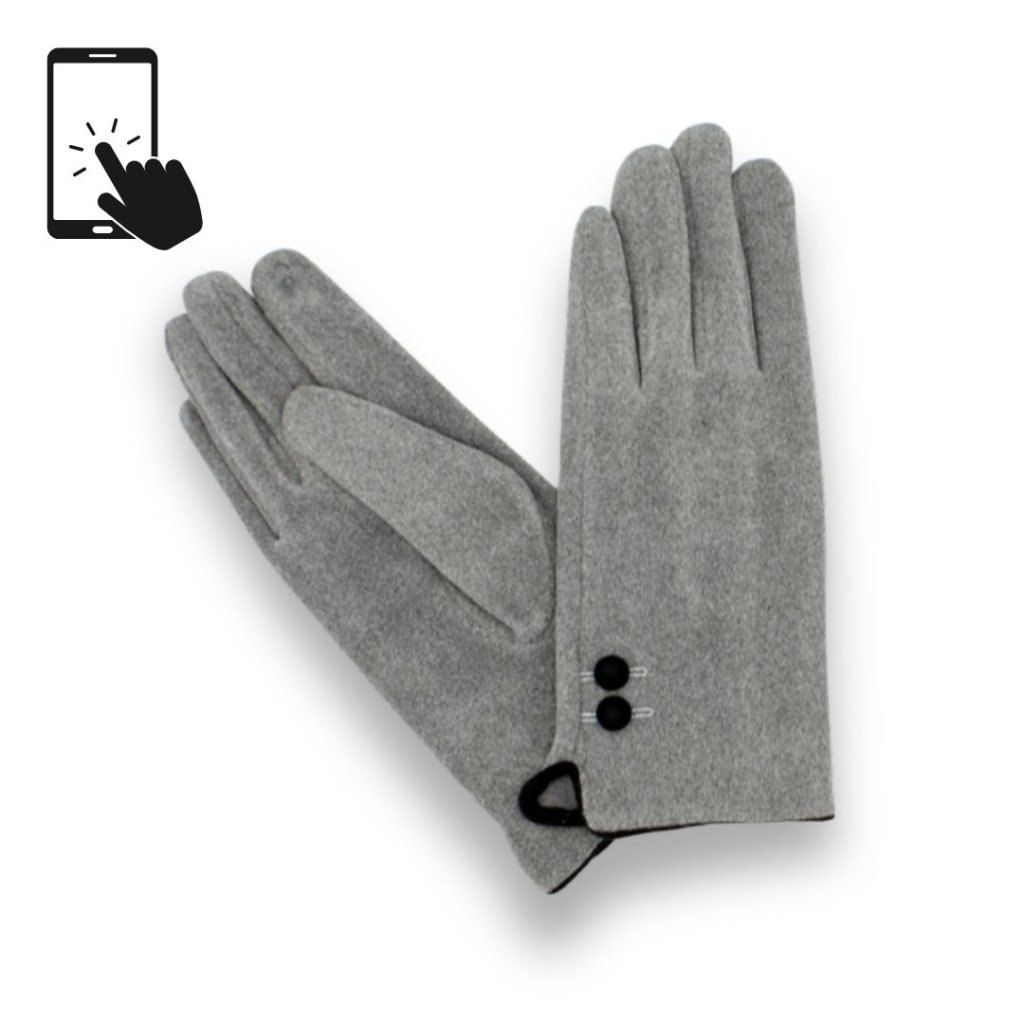 Jemné dámské šedé a velmi pružné pohodlné rukavice s podšívkou z mikroplyše jsou z vrchní části zdobené černými knoflíčky a černě lemované. Čímž vypadají rukavice velmi elegantně. Navíc mají dva prsty s bodem, který je určen na ovládání dotykového mobilu.