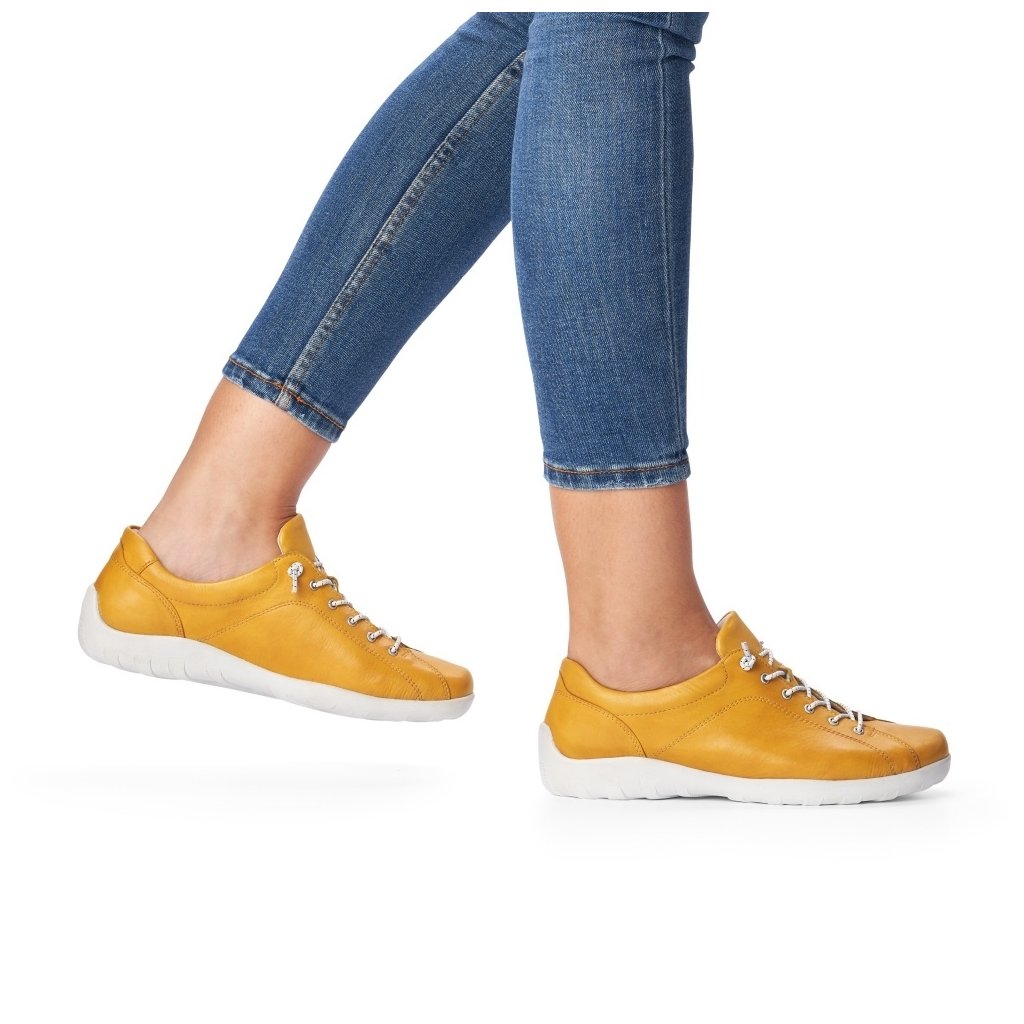 Rozjasněte svůj outfit stylovými dámskými teniskami Remonte ve žluté barvě! Tyto sportovně laděné tenisky s hladkým koženým svrškem a jemným prošíváním perfektně doplní džíny, šaty i ležérní outfit.