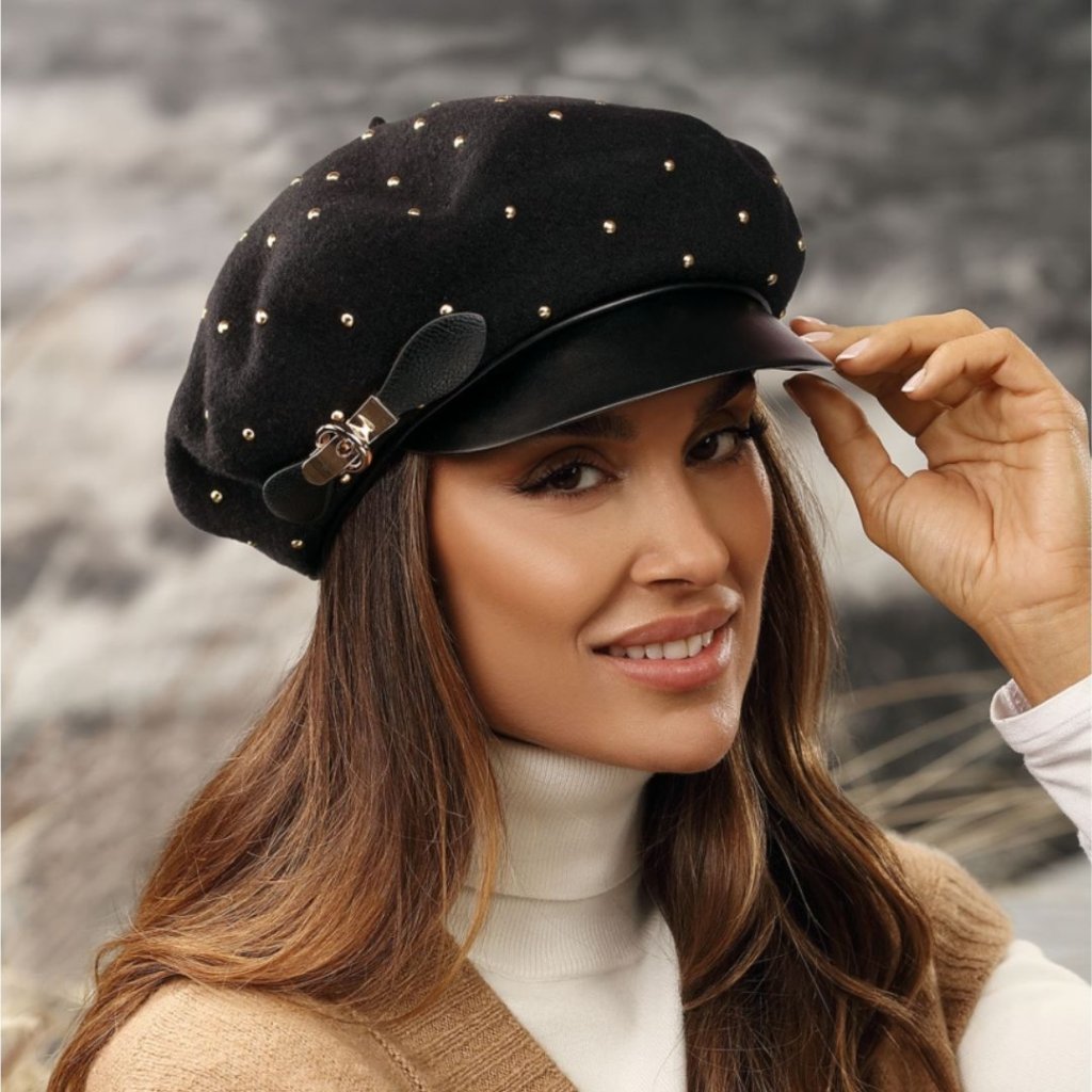 Černá zimní čepice s kšiltem je vyrobená ze 100% české certifikované vlny Woolmark quality. Uvnitř je měkká, hřejivá flísová podšívka. Výrobek je velmi ženský, koketní. Zdobený zlatými nýtky, doplněn koženkovou sponou se zlatou přezkou. Dámská černá kšiltová čepice je nadčasová klasika, která se hodí prakticky ke každému elegantnímu stylu.