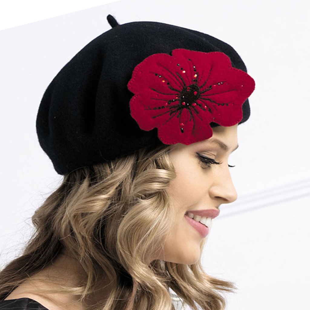 Dámský černý vlněný baret je vyroben ze 100% vlny české produkce. Tento krásný kousek je ozdobený červeným květem s jemnými kamínky. Baret je úžasný tím, že ho můžete nosit na mnoho způsobů.