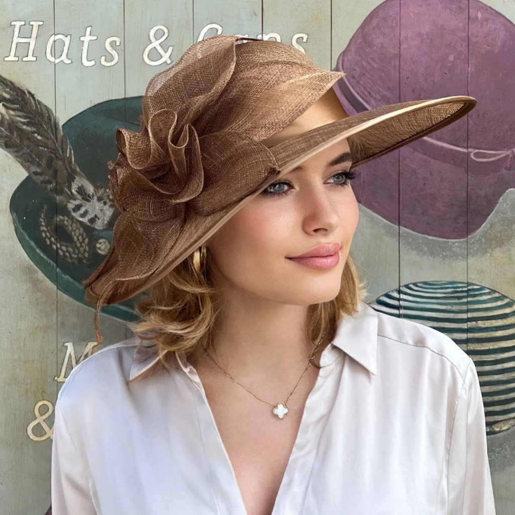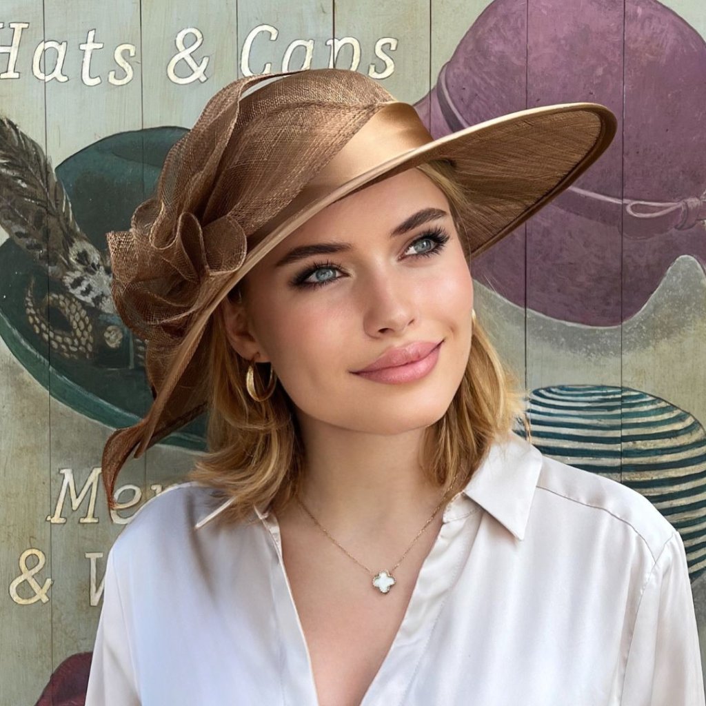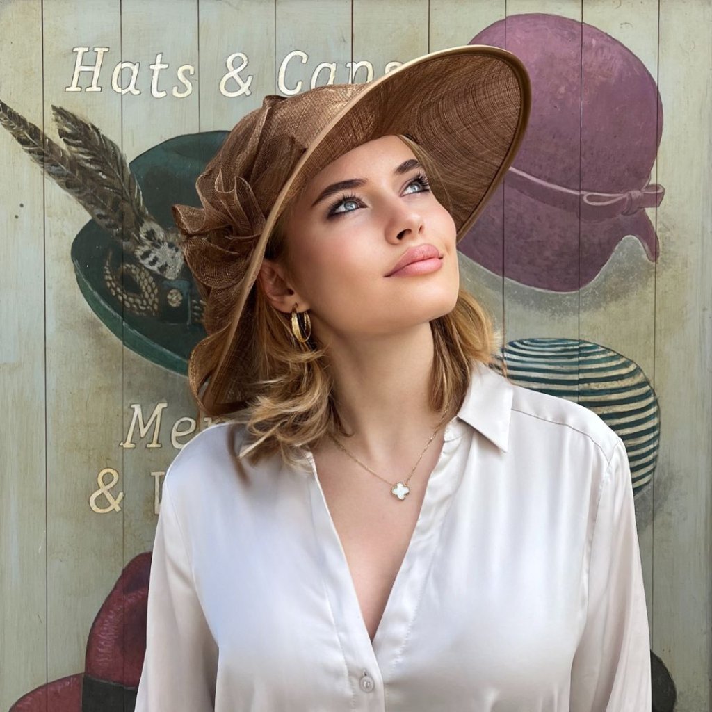 Dodejte svému outfitu šmrnc s tímto elegantním hnědým kloboukem, který je ztělesněním nadčasové ženskosti a precizního řemesla. Ručně tvarovaný z kvalitní abaky, s ozdobou a saténovou stuhou, vše v dokonale sladěných tónech, které podtrhnou vaši přirozenou eleganci.