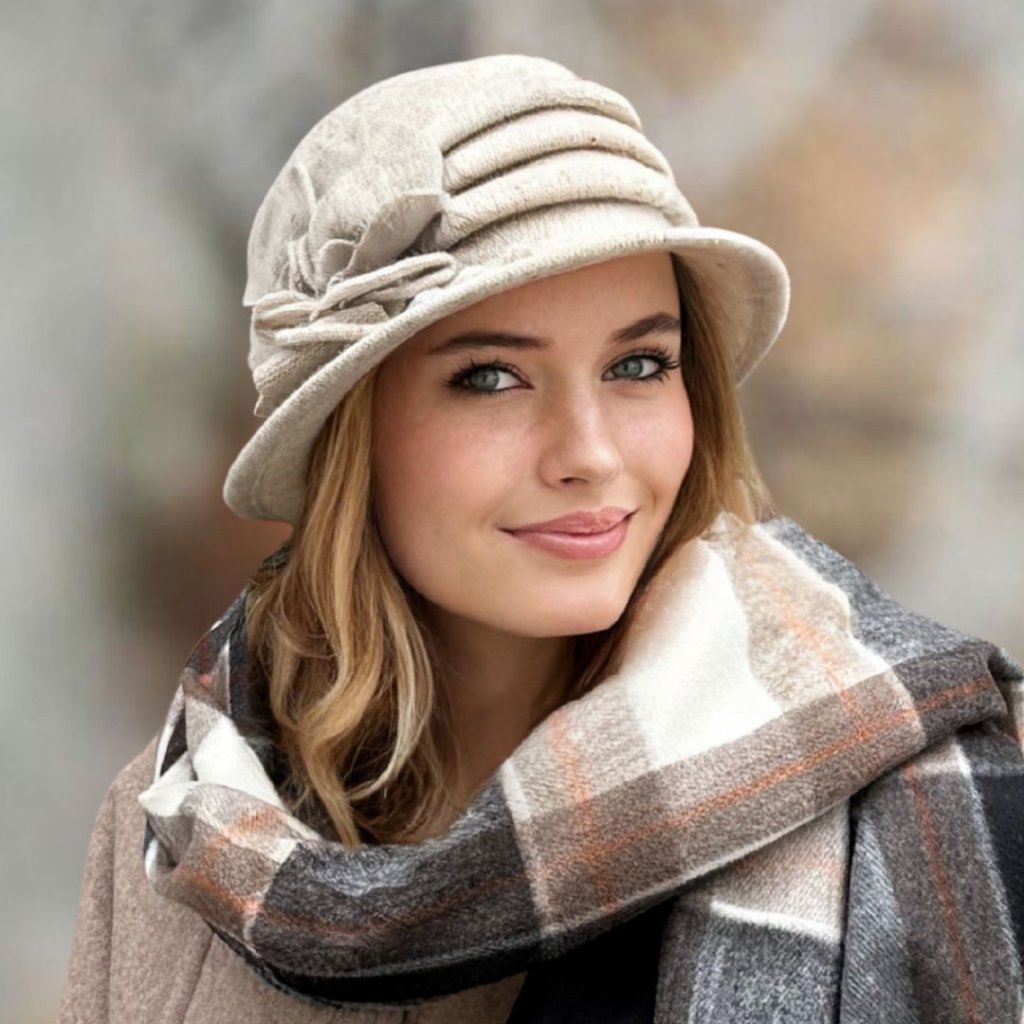 Dámský vlněný klobouček s malou krempou zdobený sámky a vlněnou aplikací květu v zimních měsících plně nahradí čepici. Klobouček má krempu, která drží tvar, ale zároveň je ohebná a tak ho budete moci dobře kombinovat i s vyšším límcem nebo šálou.