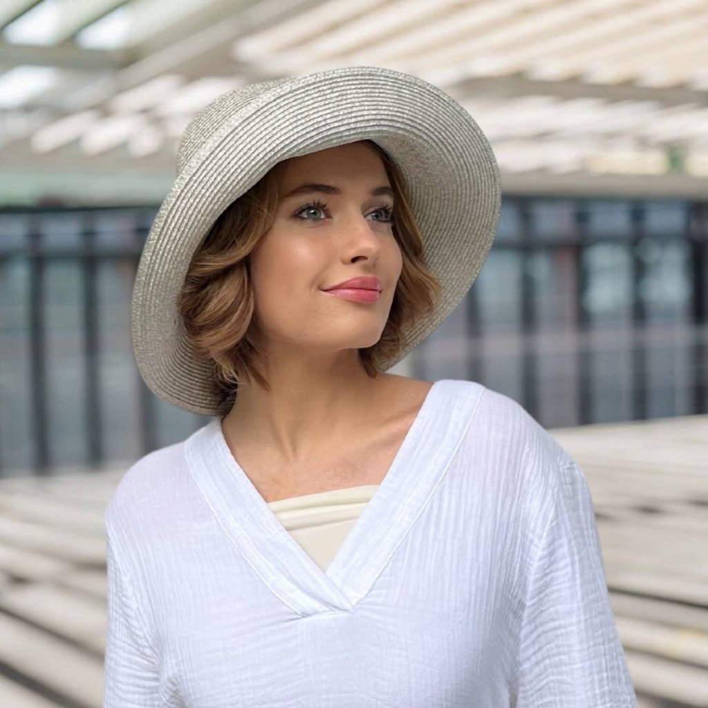 Fotografie na modelce je klobouk ve světle šedé variantě.
