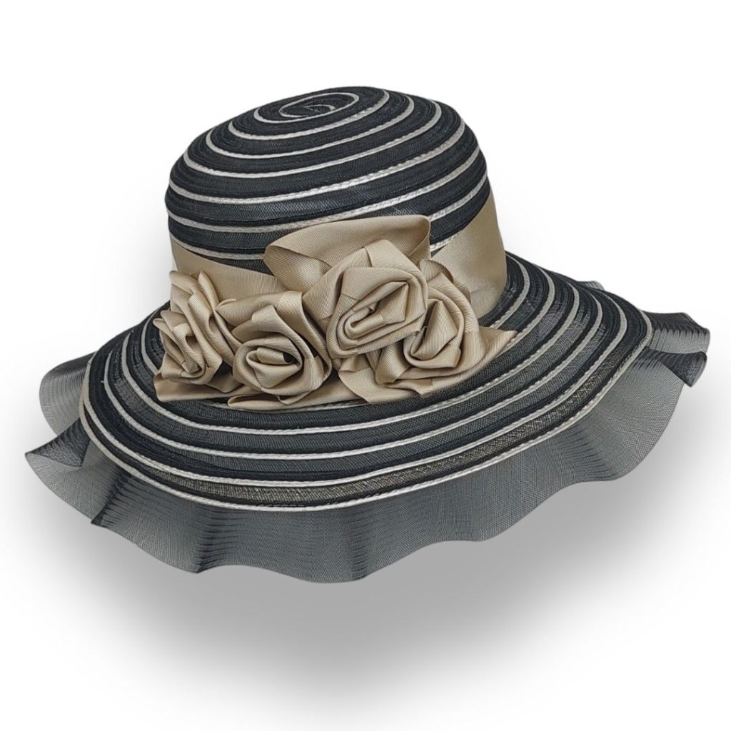 Dodejte svému outfitu šmrnc s tímto elegantním černým kloboukem, který je ztělesněním nadčasové ženskosti a precizního řemesla. Zdobený růžičkami a saténovou stuhou, vše v dokonale sladěných tónech, které podtrhnou vaši přirozenou eleganci.