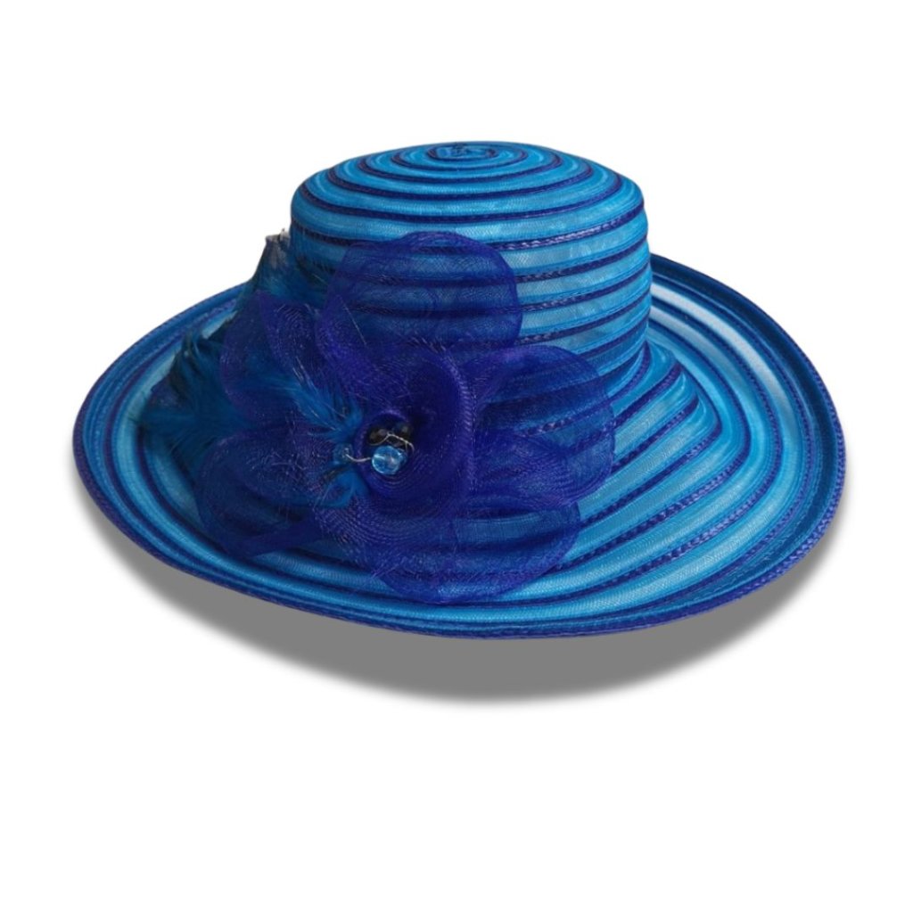 Dodejte svému outfitu šmrnc s tímto elegantním modrým kloboukem, který je ztělesněním nadčasové ženskosti a precizního řemesla. Zdobený modrými aplikacemi, vše v dokonale sladěných tónech, které podtrhnou vaši přirozenou eleganci.
