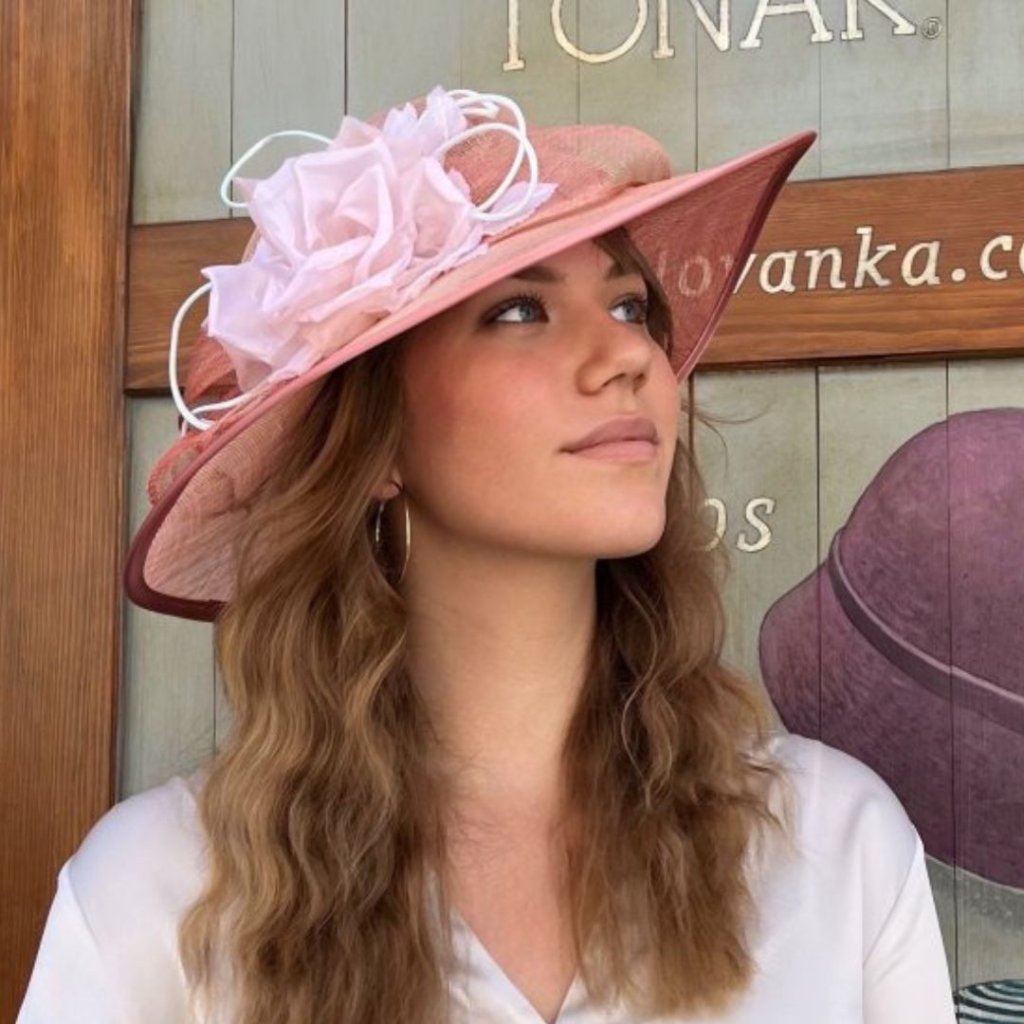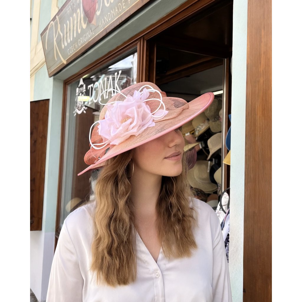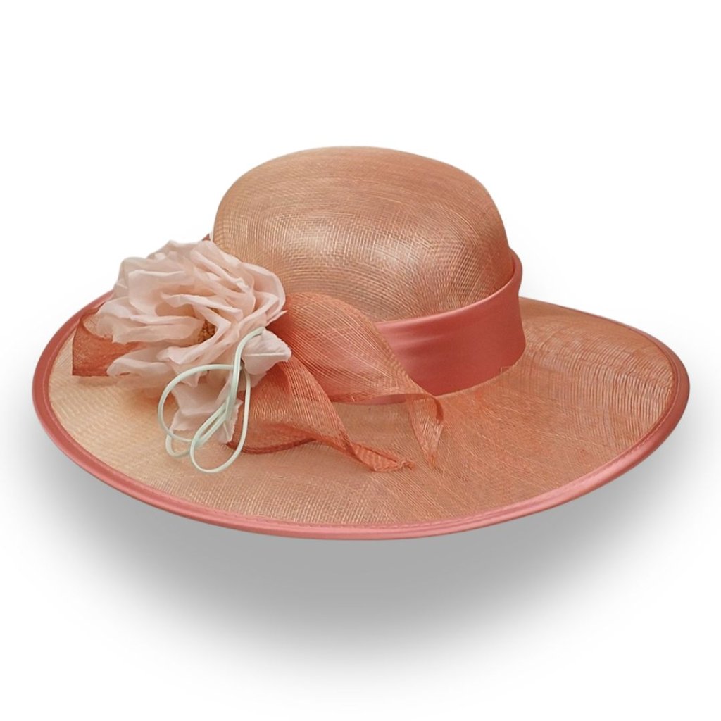 Dodejte svému outfitu šmrnc s tímto elegantním lososovým kloboukem, který je ztělesněním nadčasové ženskosti a precizního řemesla. Ručně tvarovaný z kvalitní abaky, s květinovou ozdobou a saténovou stuhou, vše v dokonale sladěných tónech, které podtrhnou vaši přirozenou eleganci.