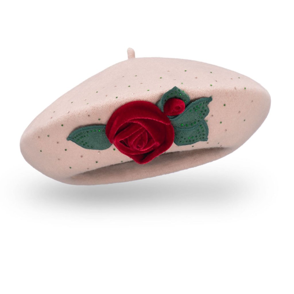 Dámský romantický zimní baret je vyroben ze 100% vlny české produkce a ručně zdobený krásnou červenou sametovou růží a zelenými vlněnými lístky s třpytivými kamínky. Dámská čepice má měkkou a hřejivou podšívku.