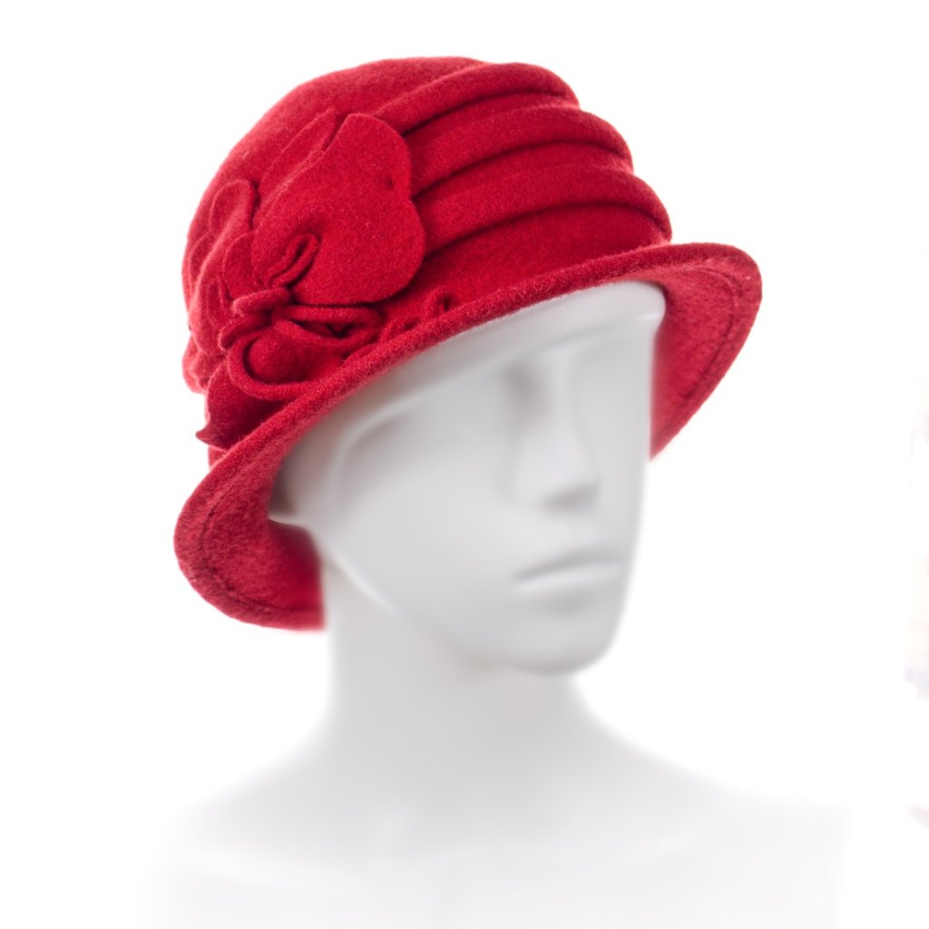 Dámský červený vlněný klobouček s malou krempou zdobený sámky a vlněnou aplikací květu v zimních měsících plně nahradí čepici. Klobouček má krempu, která drží tvar, ale zároveň je ohebná a tak ho budete moci dobře kombinovat i s vyšším límcem nebo šálou.