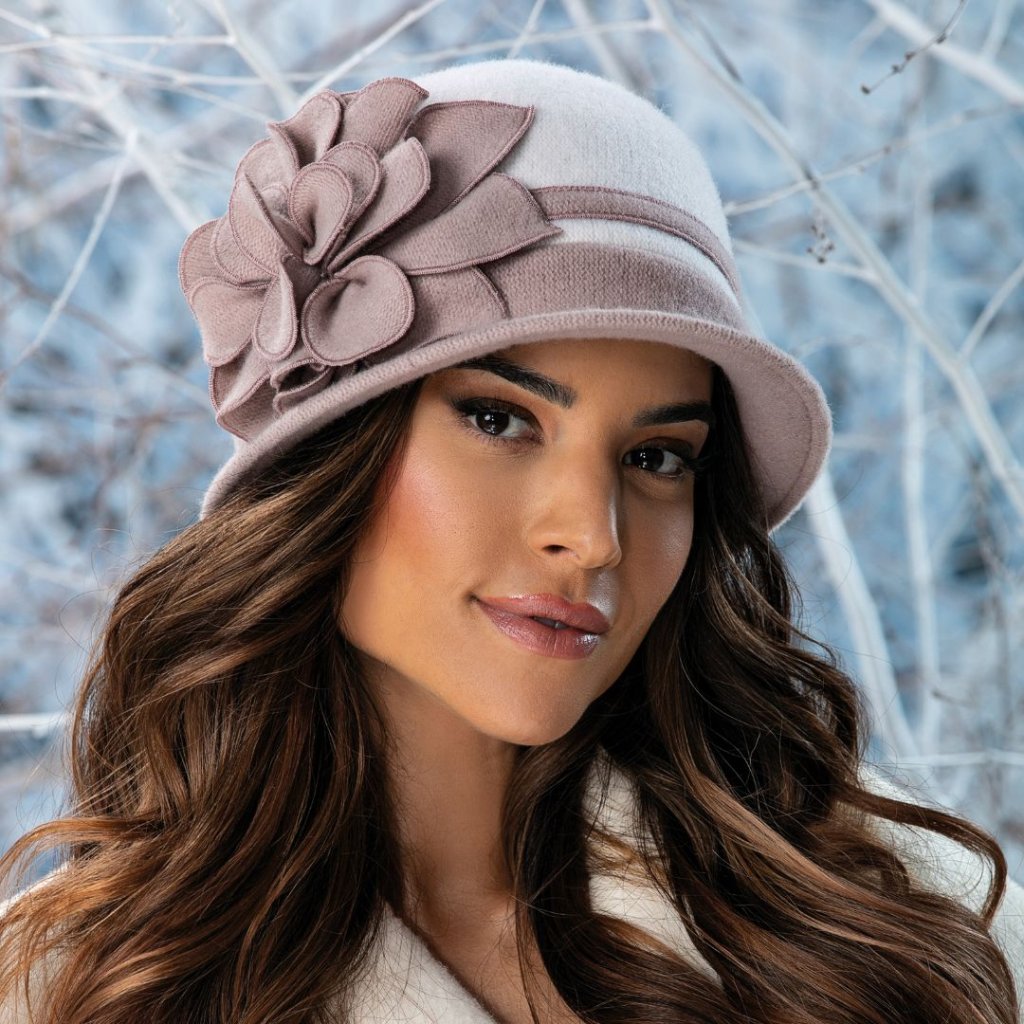 Nadčasový dvoubarevný design v jemných odstínech bílé a růžové působí elegantně a snadno se kombinuje s různými styly oblečení. Ozdobný květ, vytvořený z vlny, dodává klobouku osobitý ženský šarm a dělá z něj originální módní doplněk, který vynikne v každé situaci.