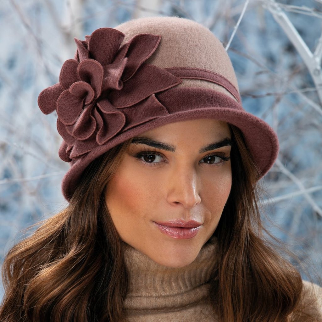 Klobouk má klasickou malou krempu, která drží tvar, ale zůstává ohebná a praktická i při nošení s vyšším límcem kabátu nebo šálou. Ozdobný květ, tvořený z vlny, dodává klobouku osobitý šarm a jemnou ženskost. Díky harmonickému ladění barev se klobouk snadno kombinuje s různými zimními outfity, od elegantních kabátů po elegantní bundy.