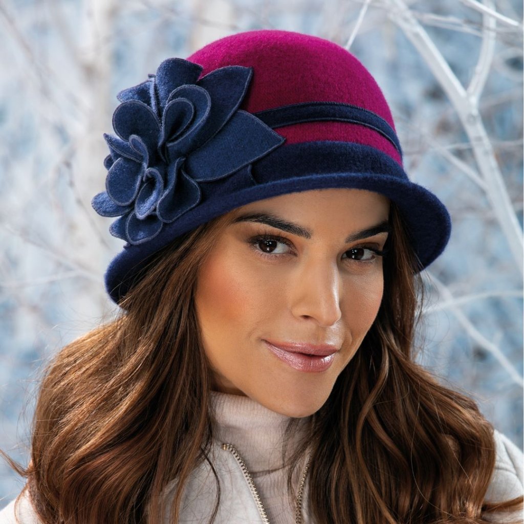 Klobouk má klasickou malou krempu, která drží tvar, ale zůstává ohebná a praktická i při nošení s vyšším límcem kabátu nebo šálou. Ozdobný květ, tvořený ručně z vlny, dodává klobouku osobitý šarm a jemnou ženskost. Díky harmonickému ladění barev se klobouk snadno kombinuje s různými zimními outfity, od elegantních kabátů po elegantní bundy.