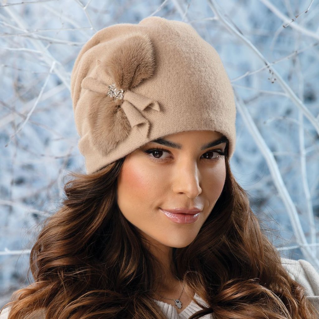 Elegantní dámská zimní čepice Krumlovanka – béžová - 100% vlna s kožešinou W-0883/284