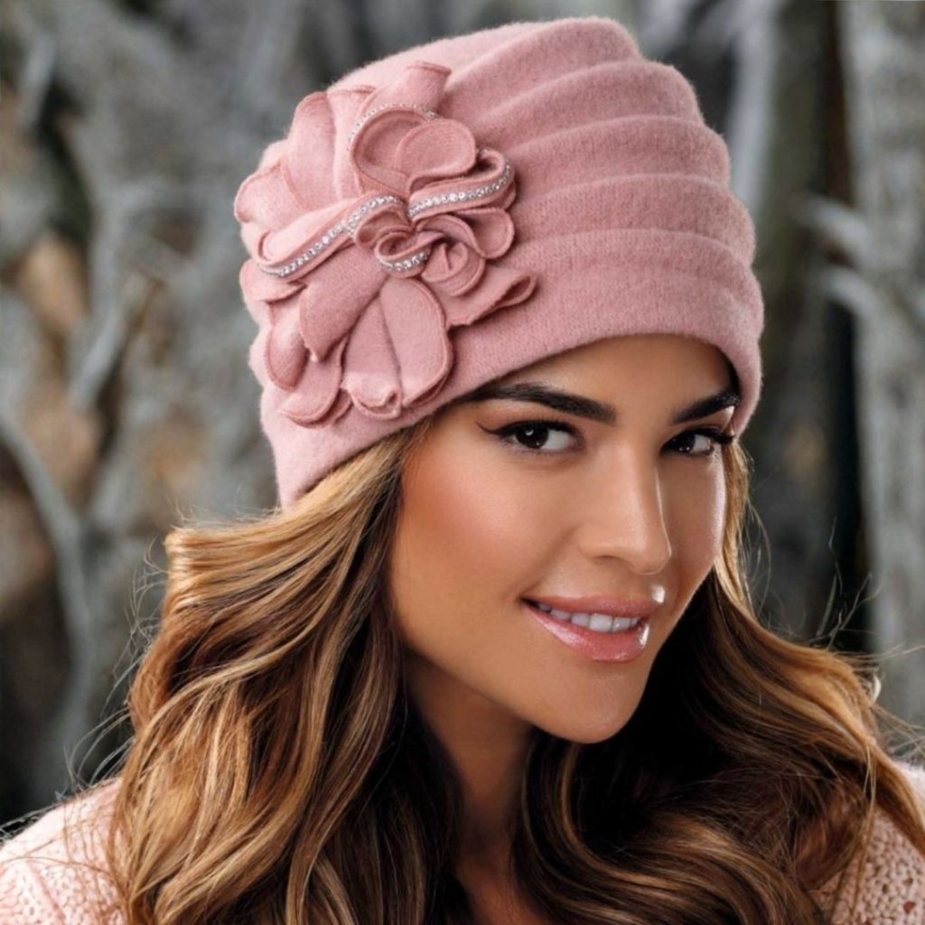 Starorůžová zimní čepice vyrobená z nejemnější certifikované vlny WoolMark. Vlněná čepice skvěle sedí a je precizně propracovaná, zdobená ručně nápaditou aplikací květu s kamínky, která čepici dodává půvab.