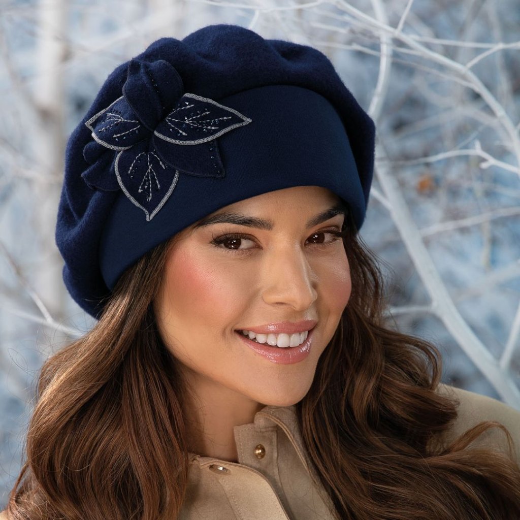 Čepice je navržena tak, aby seděla i ženám s větším obvodem hlavy, a díky kombinaci materiálů poskytuje maximální komfort bez ztráty elegance. Dekorativní květinový prvek dodává celému modelu sofistikovaný a ženský nádech.