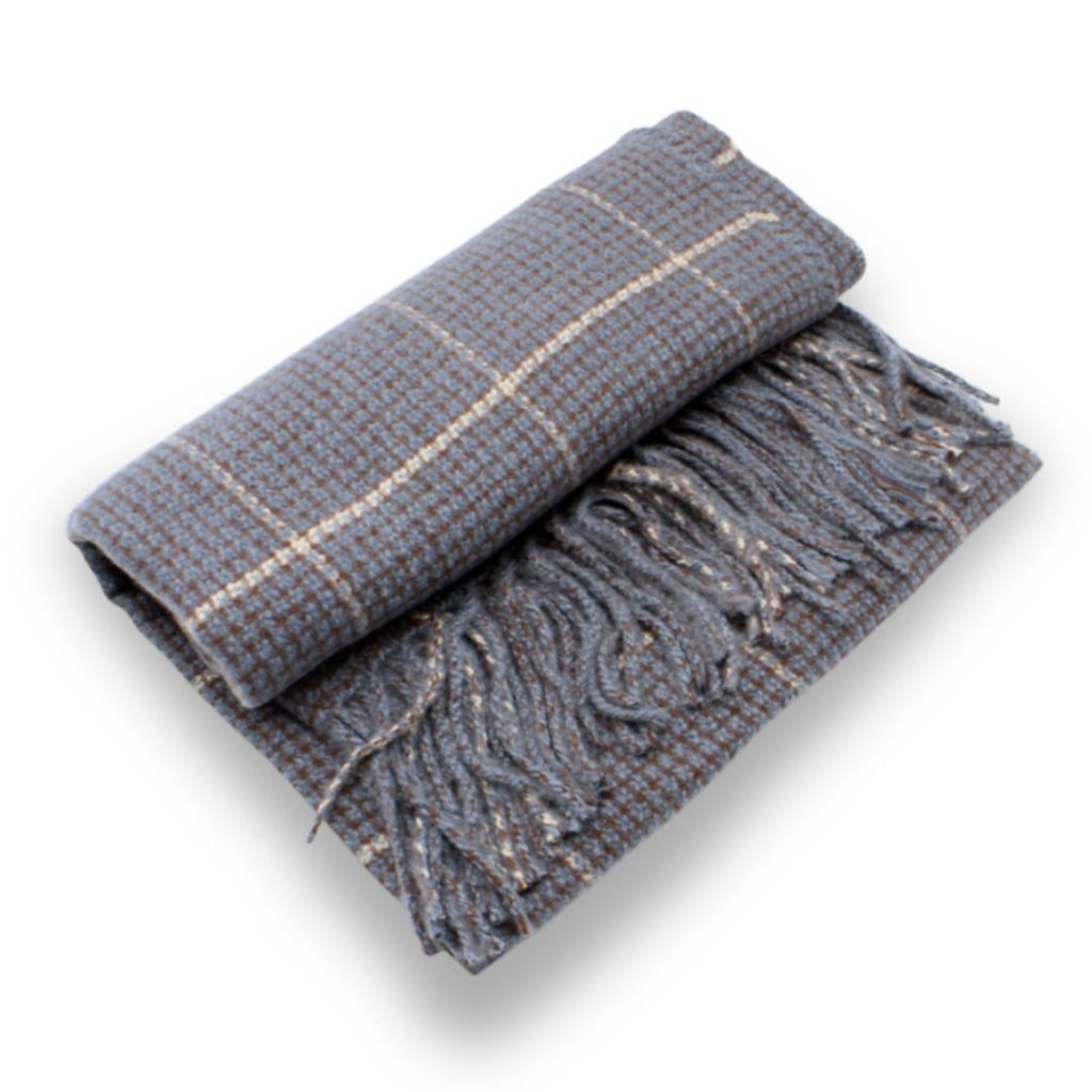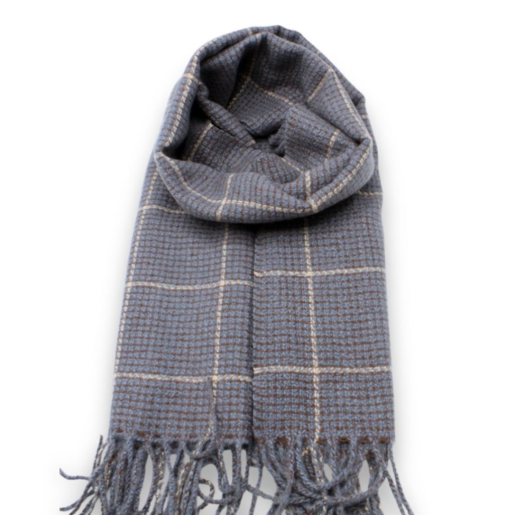 Stylová zimní šála s kostkovaným vzorem v decentních tónech modré a hnědé, která perfektně doplní váš podzimní i zimní outfit. Tato šála je vyrobena z měkkého materiálu s jemným kašmírovým omakem, který poskytuje maximální komfort a hřejivost bez nutnosti použití pravého kašmíru.