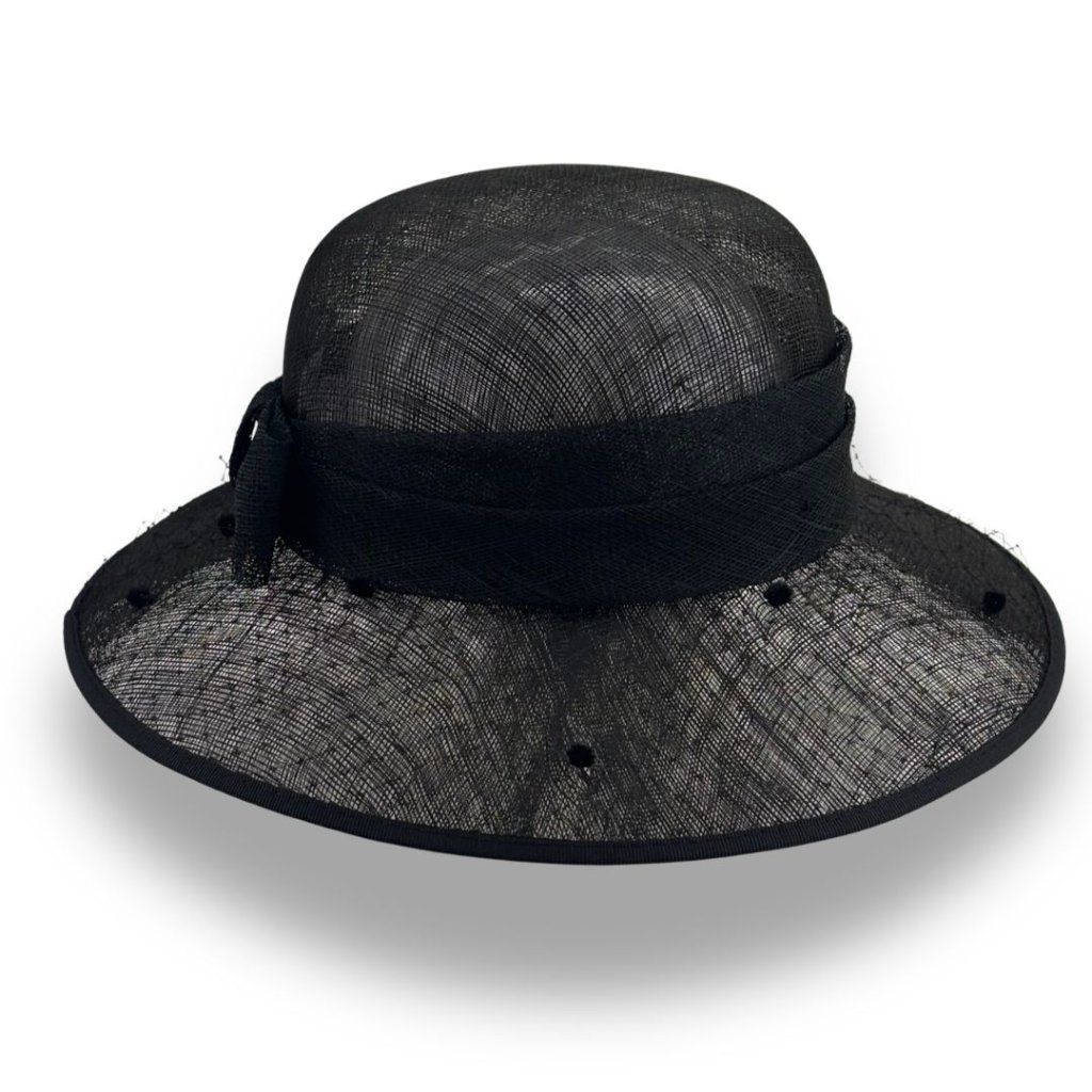 Dodejte svému outfitu šmrnc s tímto společenským elegantním černým kloboukem, který je ztělesněním nadčasové ženskosti a precizního řemesla. Ručně tvarovaný z kvalitní abaky, zdobený jemnou mašlí v kombinaci s černou barvou a krempou potaženou francouzským závojem, které podtrhnou vaši přirozenou eleganci a šmrnc.