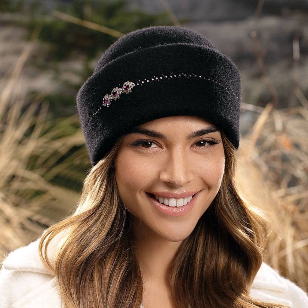 Tato dámská zimní čepice v elegantní černé barvě zaujme jemným leskem kamínků, které zdobí spodní lem a vytvářejí decentní květinový motiv na boku. Je ideální volbou pro ženy, které chtějí v zimě zůstat v teple, a přitom si zachovat styl a ženskost. Čepice působí vkusně, nepřehlédnutelně, ale přitom nenápadně – přesně tak, jak si to zimní elegance žádá.