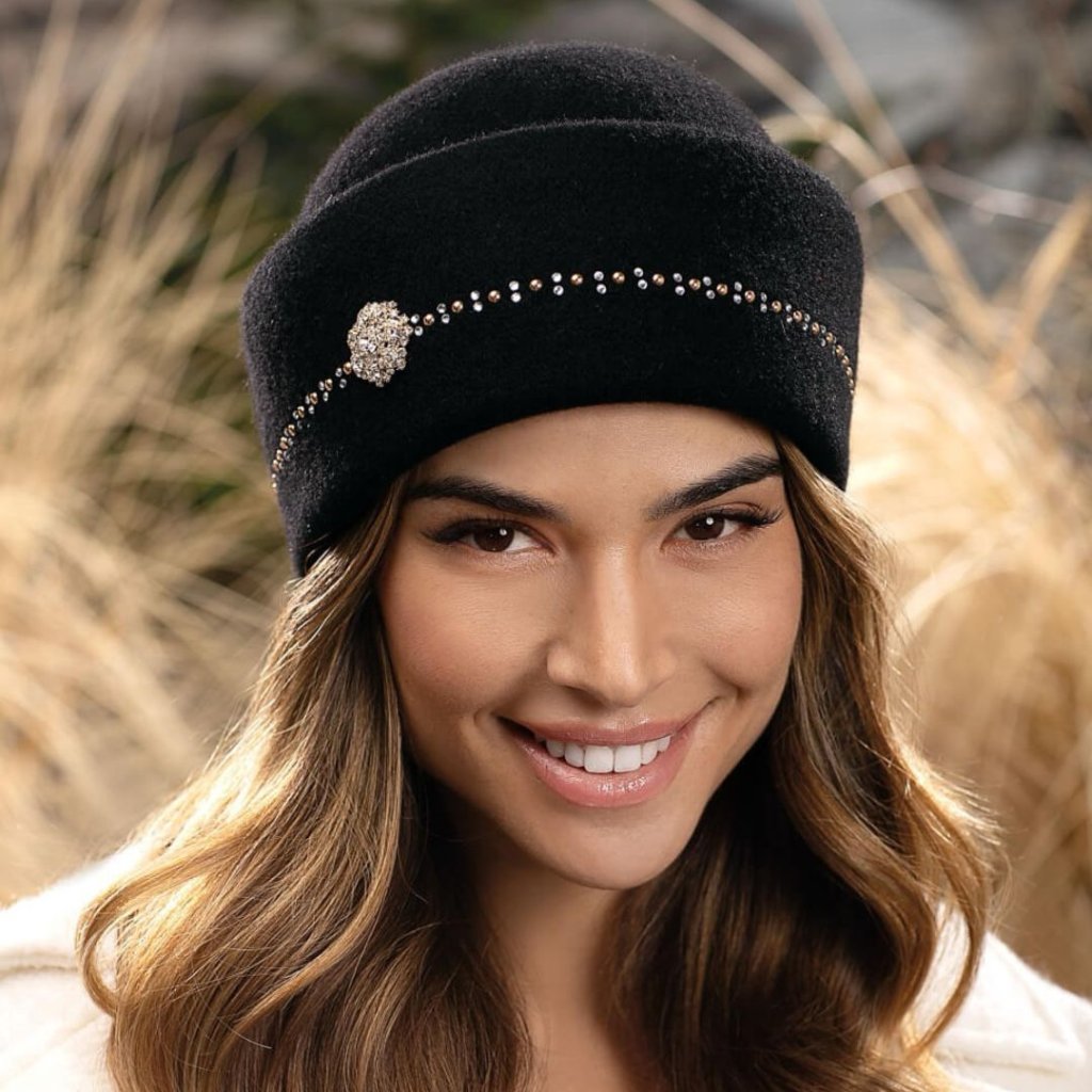 Tato dámská zimní čepice v elegantní černé barvě zaujme jemným leskem kamínků, které zdobí spodní lem a vytváří elegantní a decentní vzhled. Je ideální volbou pro ženy, které chtějí v zimě zůstat v teple, a přitom si zachovat styl a ženskost. Čepice působí vkusně, nepřehlédnutelně, ale přitom nenápadně – přesně tak, jak si to zimní elegance žádá.