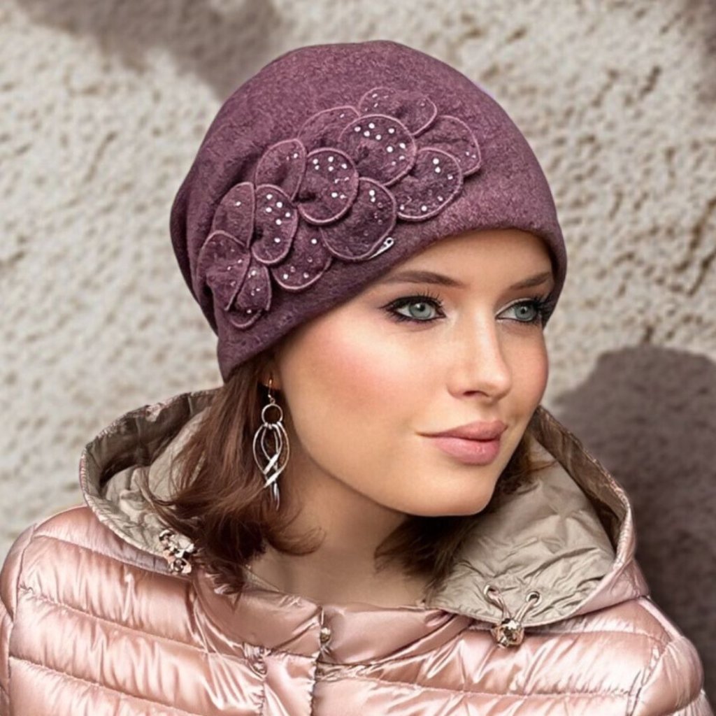Fialová melanž vlněná čepice ze 100% české vlny se značku Woolmark Quality Díky kvalitním materiálům tento kousek perfektně doplní nejen váš kabátek, ale zahřeje vás i na horách a skvěle doladí váš volnočasový outfit. čepice je ozdobená překládanými plátky s kamínky. Naše zimní čepice jsou zárukou, že Vás skvěle zahřejí a zároveň Vám budou slušet.