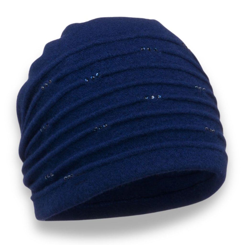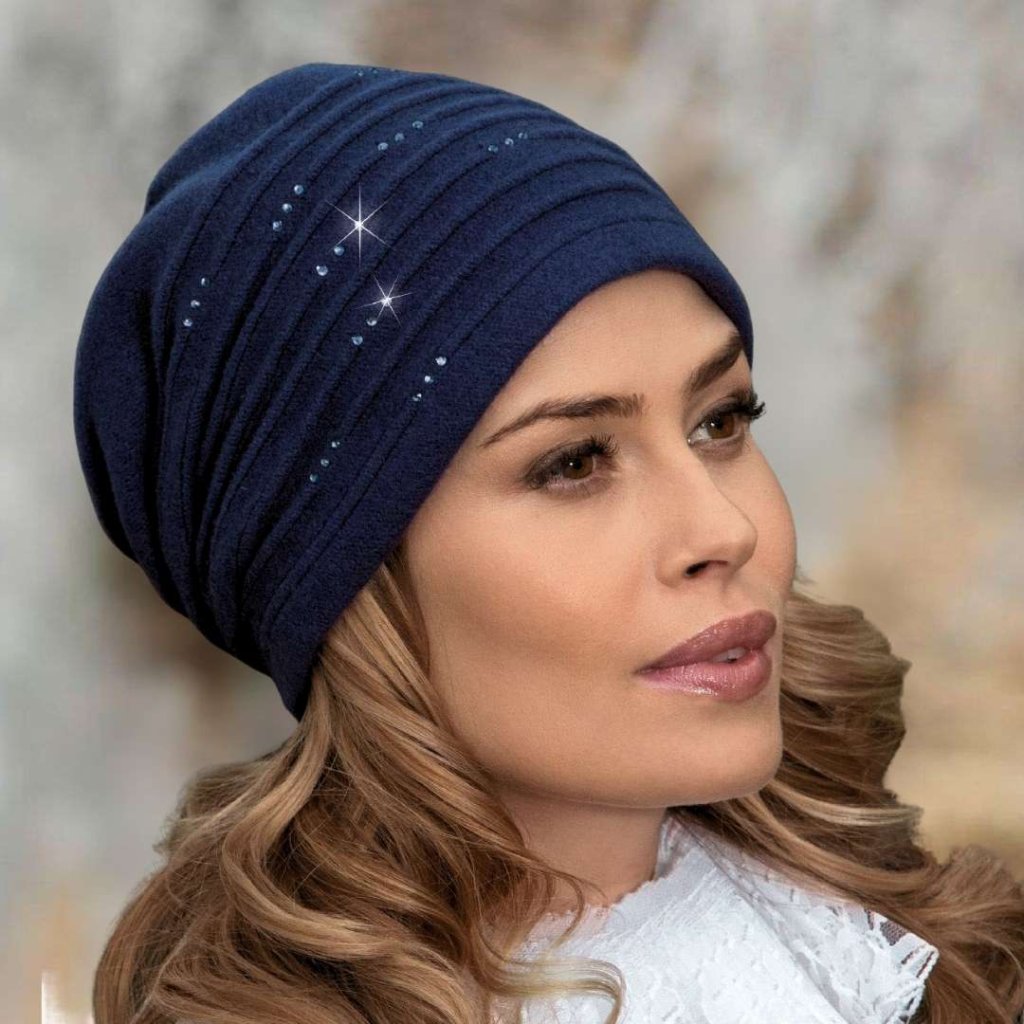 Modrá dámská zimní čepice ze 100% české vlny se značku Woolmark Quality je ušitá v moderním spadlém střihu, který je velmi slušivý a pohodlný. Je ručně ozdobená prošívanými sámky a kamínky. Díky kvalitním materiálům tento kousek perfektně doplní nejen váš kabátek, ale zahřeje vás i na horách a skvěle doladí váš volnočasový outfit.