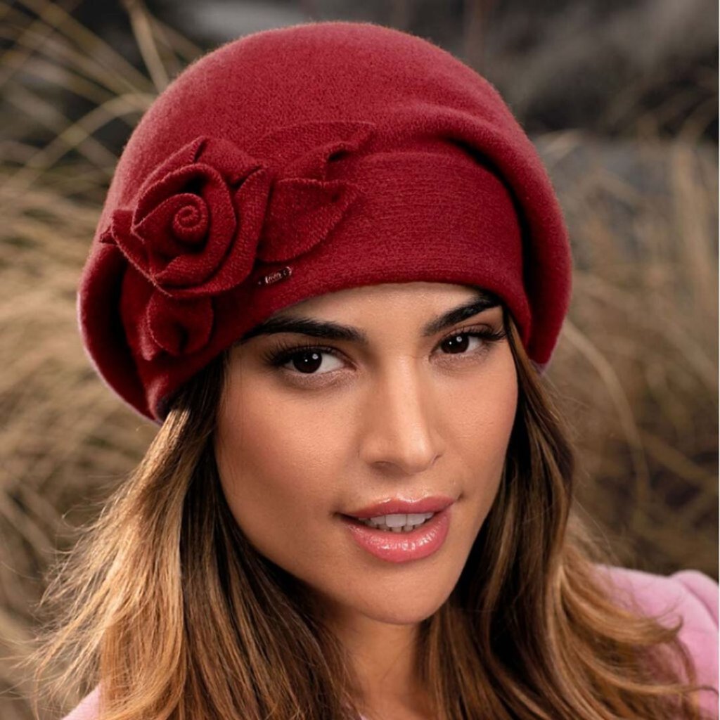 Vlněná vínová dámská čepice ze 100% české vlny se značku Woolmark Quality je ušitá v moderním baretovém spadlém střihu, který je velmi slušivý a pohodlný. Vlněný baret s lemem je ručně ozdoben aplikací květů v barvě vlny. Díky kvalitním materiálům tento kousek perfektně doplní nejen váš kabátek, ale doladí i váš volnočasový outfit.