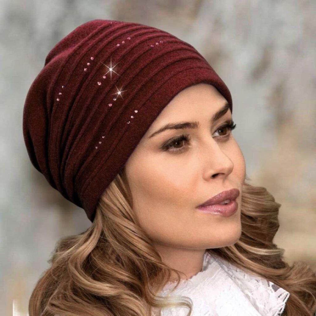 Vínová dámská zimní čepice ze 100% české vlny se značku Woolmark Quality je ušitá v moderním spadlém střihu, který je velmi slušivý a pohodlný. Je ručně ozdobená prošívanými sámky a kamínky. Díky kvalitním materiálům tento kousek perfektně doplní nejen váš kabátek, ale zahřeje vás i na horách a skvěle doladí váš volnočasový outfit.