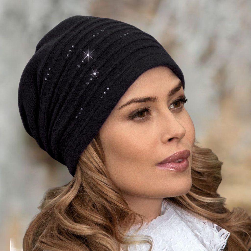 Černá zimní čepice ze 100% české vlny se značku Woolmark Quality je ušitá v moderním spadlém střihu, který je velmi slušivý a pohodlný. Je ručně ozdobená prošívanými sámky a kamínky. Díky kvalitním materiálům tento kousek perfektně doplní nejen váš kabátek, ale zahřeje vás i na horách a skvěle doladí váš volnočasový outfit.