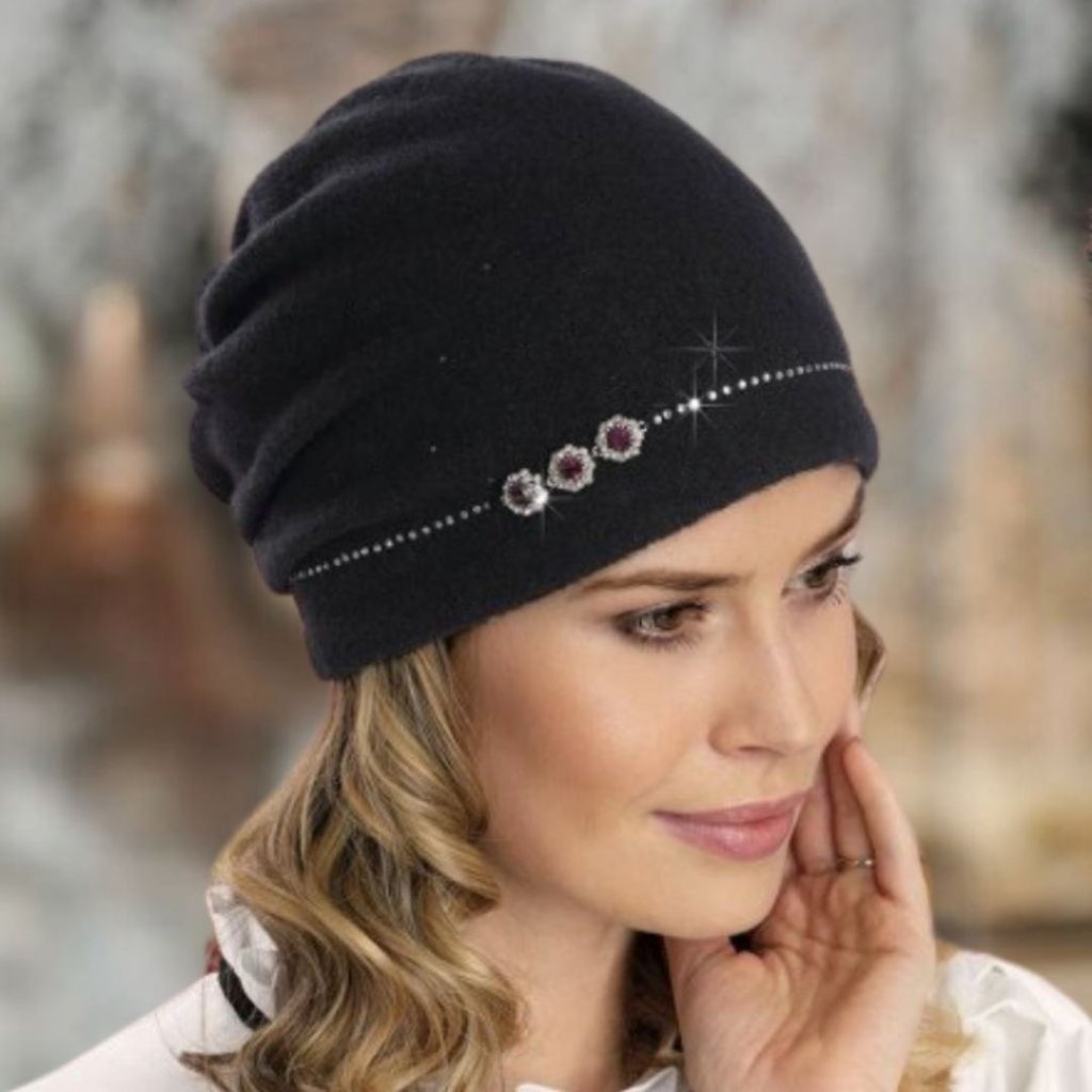 Tato dámská zimní čepice v elegantní černé barvě zaujme jemným leskem kamínků, které zdobí spodní lem a vytvářejí decentní květinový motiv na boku. Je ideální volbou pro ženy, které chtějí v zimě zůstat v teple, a přitom si zachovat styl a ženskost. Čepice působí vkusně, nepřehlédnutelně, ale přitom nenápadně – přesně tak, jak si to zimní elegance žádá.