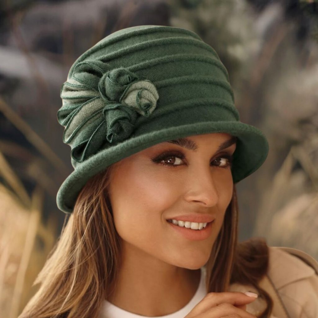 Dámský vlněný zelený klobouček s malou krempou zdobený sámky a vlněnou aplikací v zimních měsících plně nahradí čepici. Klobouček má krempu, která drží tvar, ale zároveň je ohebná a tak ho budete moci dobře kombinovat i s vyšším límcem nebo šálou.