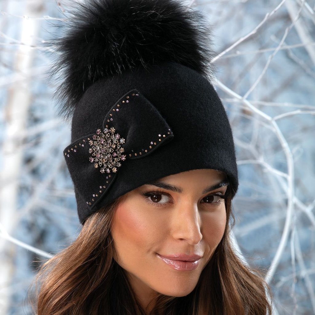 Krumlovanka Luxusní černá dámská zimní čepice s bambulí z 100% vlny W-0905/018