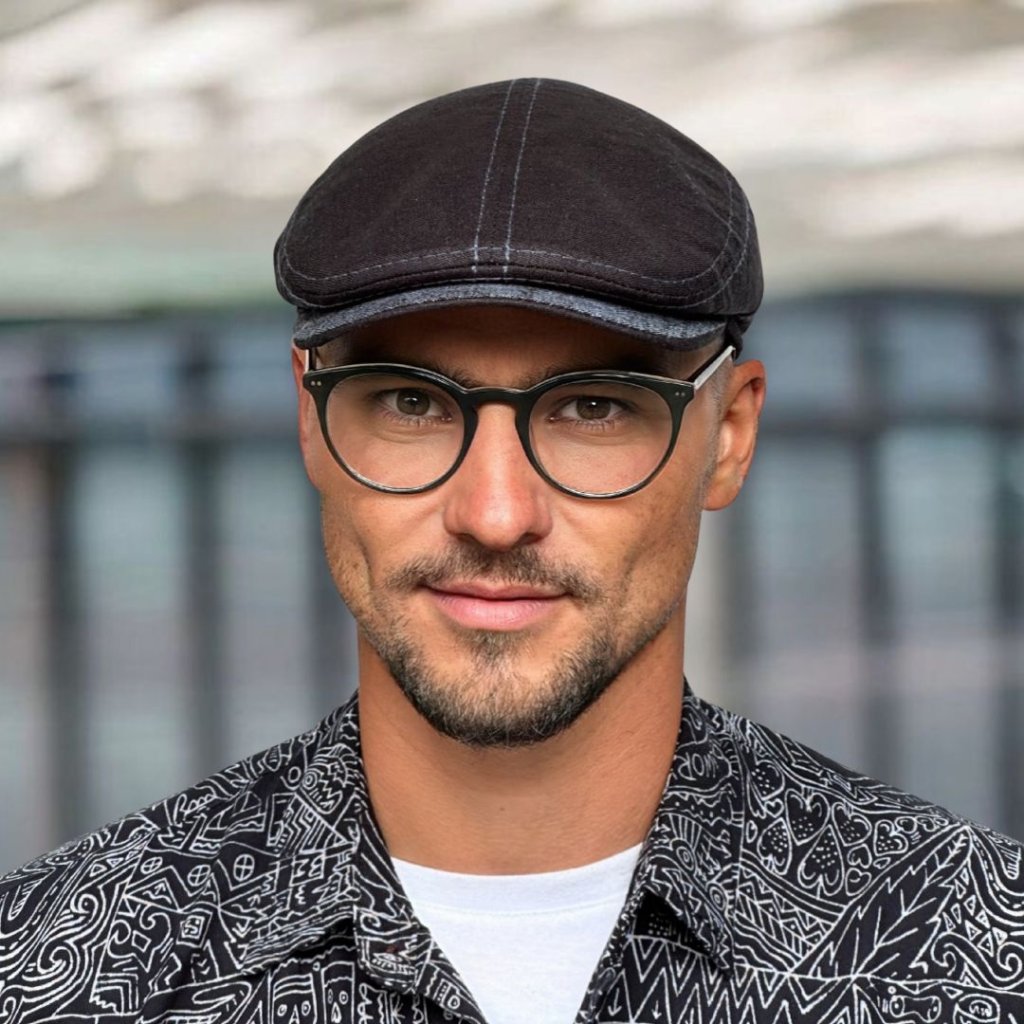 Černá lněná bekovka je precizně ušitá z kvalitní italské 100% lněné látky. Kšilt je podšitý z vrchní strany a spolu s modrými prošitými švy a decentními minimalistickými detaily vytváří elegantní, sportovně laděný vzhled.