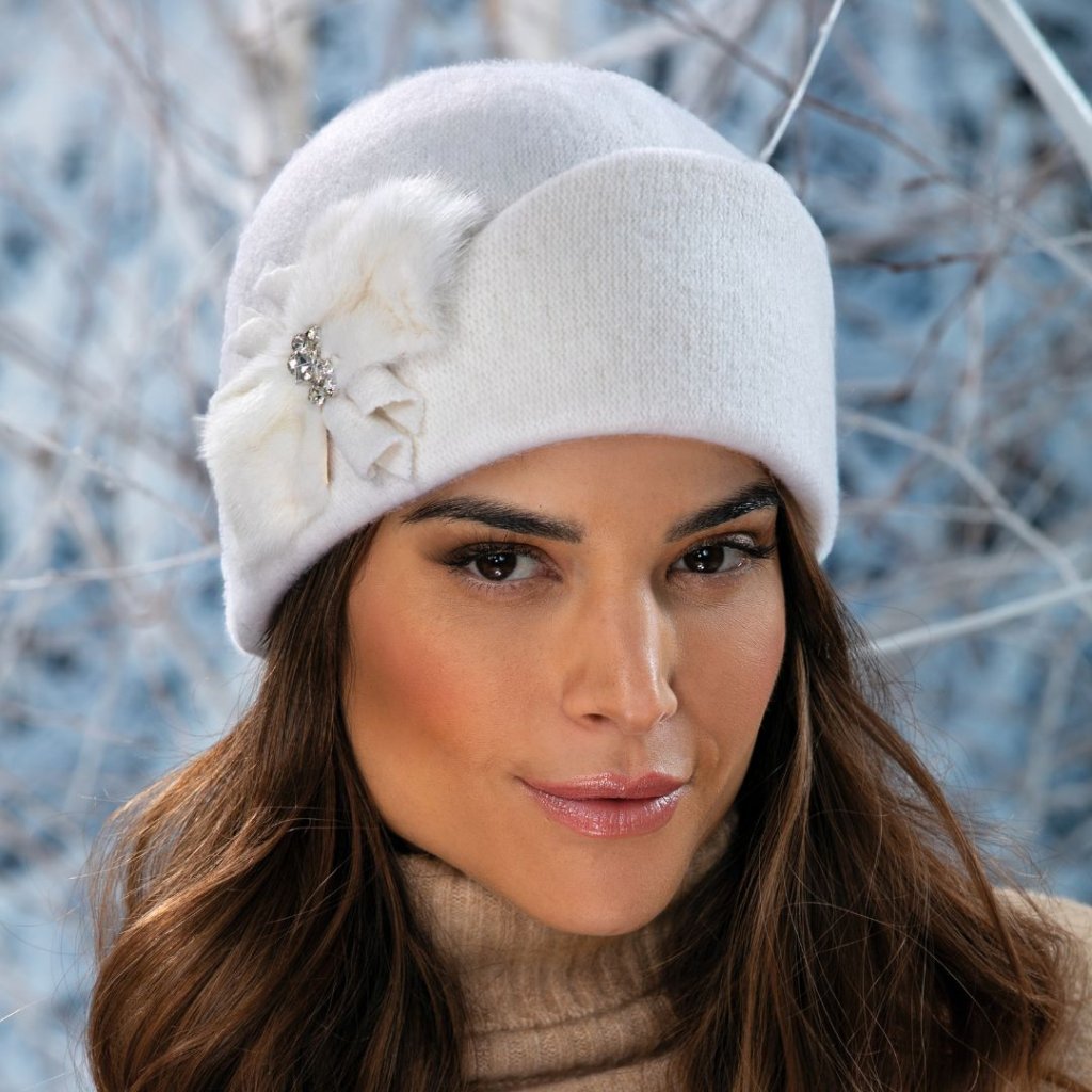 Tato elegantní dámská zimní bílá čepice je ideálním doplňkem pro chladné měsíce. Její rafinovaný design sází na nadčasovou bílou barvu a výrazné, přesto jemné zdobení, čepice je doplněna dekorací z jemné kožešinky a blyštivých kamínků ve středu, které dodávají lesk i ženský půvab.