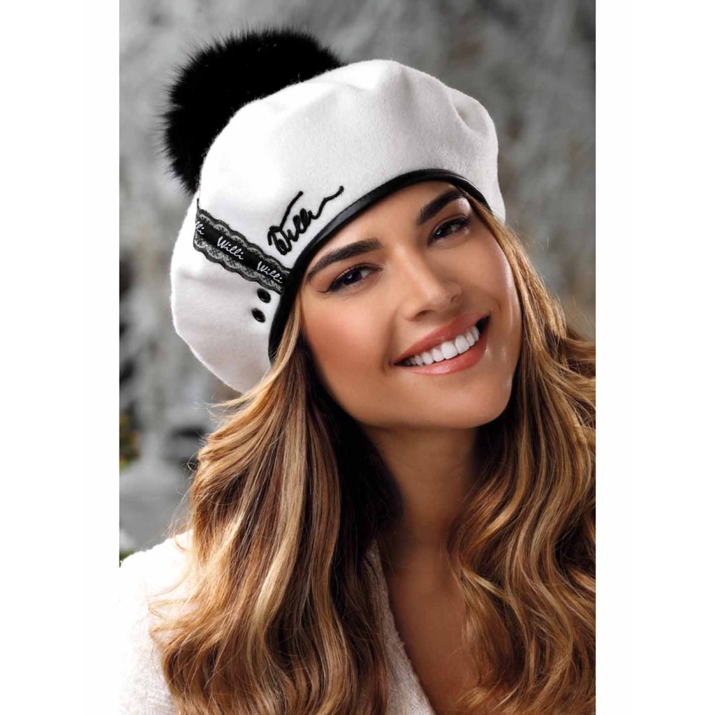 Luxusní bílý dámský baret s černou bambulí W-0742/000