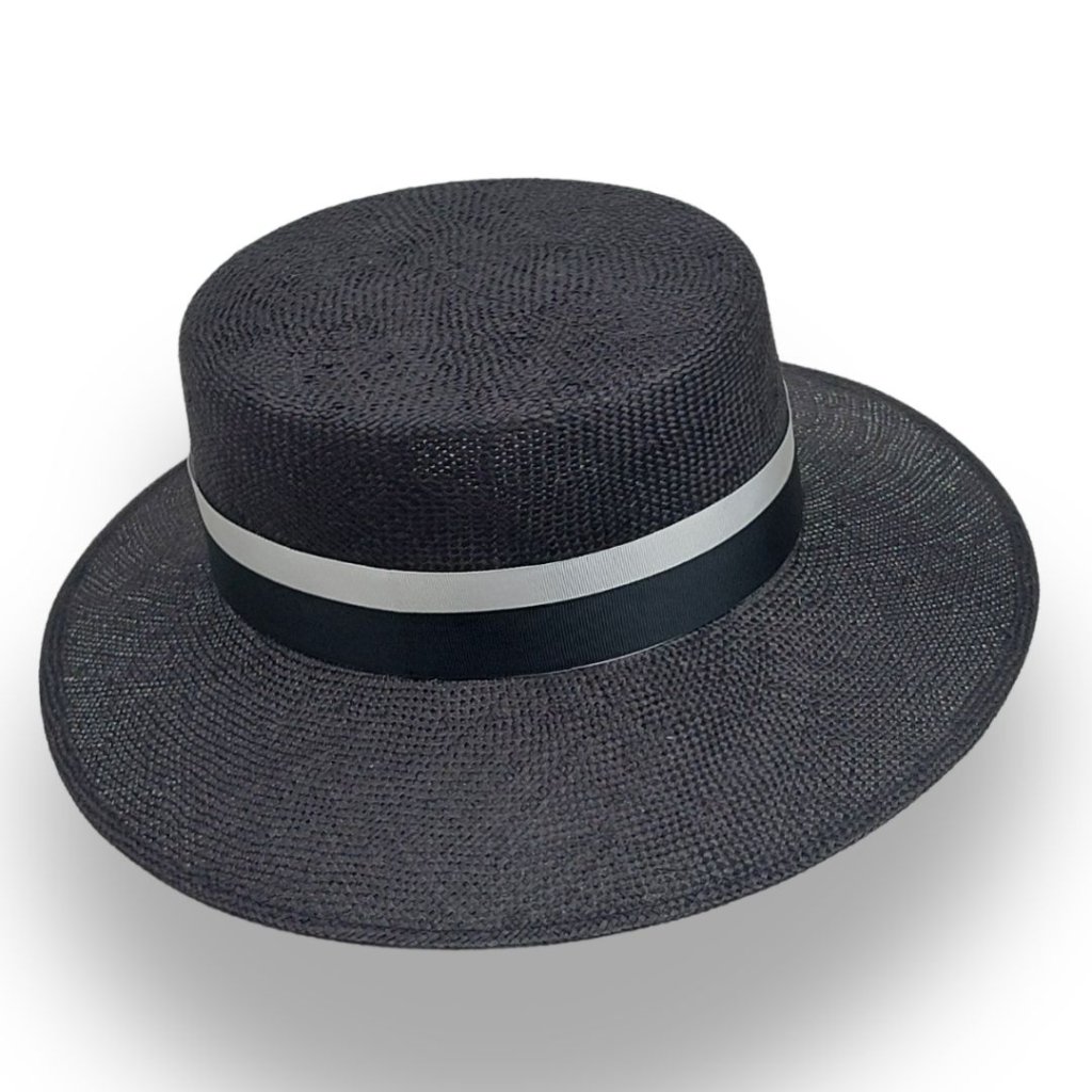 Luxusní slaměný boater klobouk slavnostní Canotier černomodrý - 100% paglie C-074