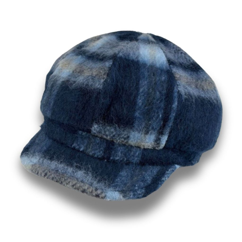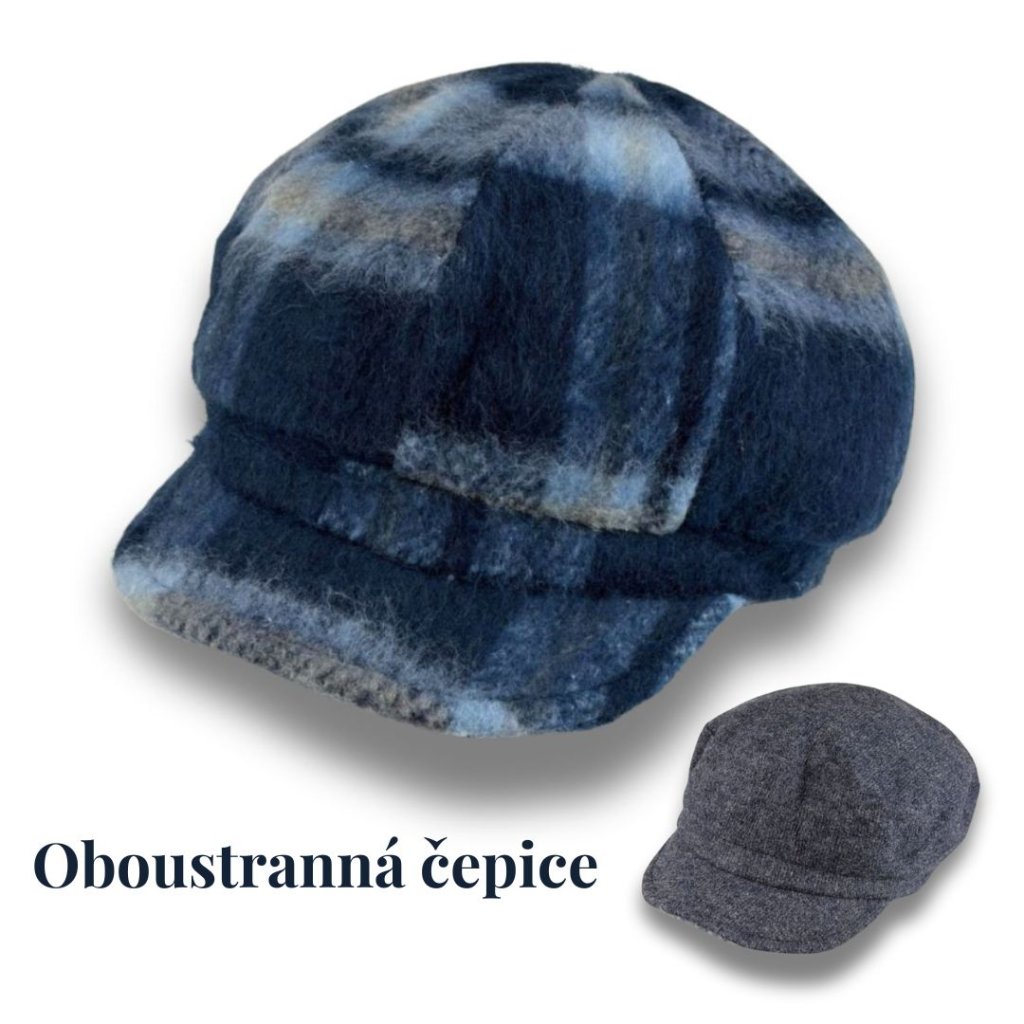 Tato oboustranná dámská čepice nabízí dvě barevně i stylově odlišné varianty v jednom. První strana je provedena jako osmidílná čepice s kšiltem v kombinaci tmavě modré, světle modré a šedé, vytvářející jemný kostkovaný melír. Tento design působí elegantně, originálně a snadno doplní kabáty i casual outfity.