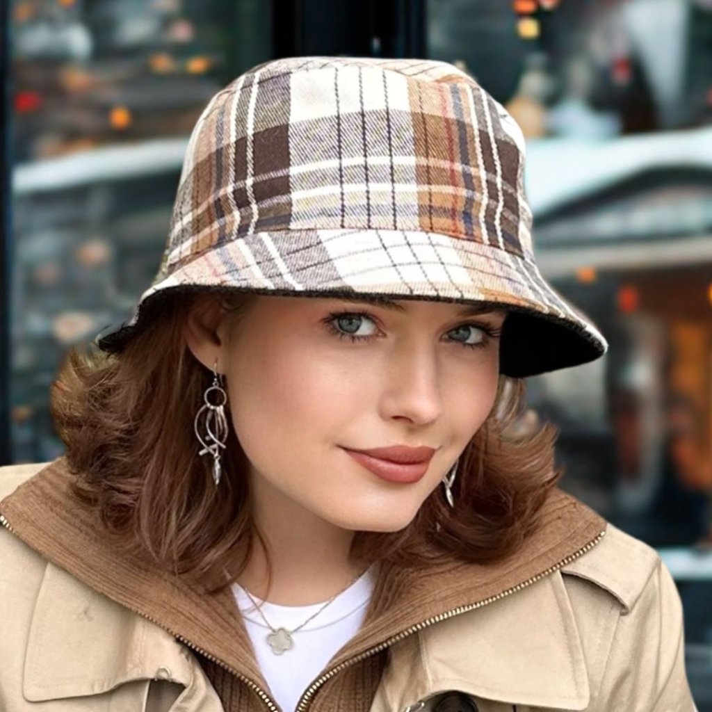 Stylový unisex oboustranný bucket hat v zeleném provedení z jedné strany a v béžovém károvaném vzoru z druhé. Tvarovatelná krempa umožňuje přizpůsobit si vzhled klobouku.