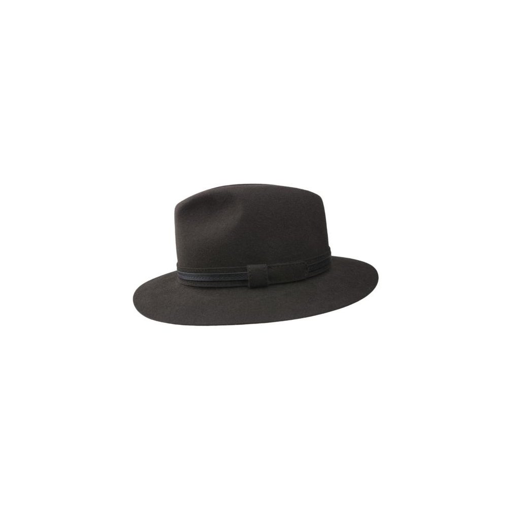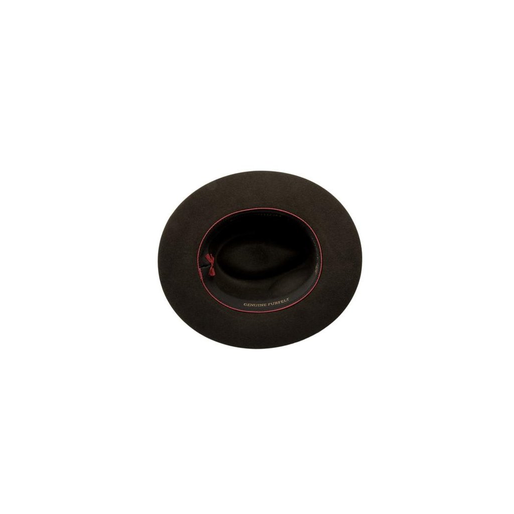 Pánský plstěný klobouk v hnědé barvě je zdobený kombinací plstěného pásku a koženého řemínku, vybaven strečovým potním páskem . Šíře krempy 6 cm.