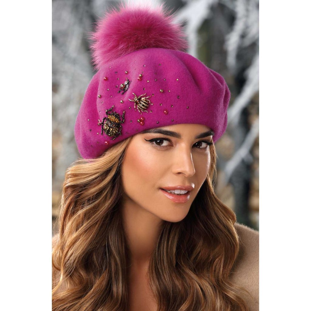Dámský baret vyrobený z nejkvalitnější vlny s certifikátem Woolmark. Růžový baret je ručně zdobený elegantní dekorací skarabeů posetých zirkony a všitými zlatými korálky s přidanými jemně třpytivými krystaly. Celek je doplněn přírodní kožešinovou bambulí obarvenou do tónu barvy vlny. Tato jedinečná pokrývka hlavy má měkkou a hřejivou podšívku.