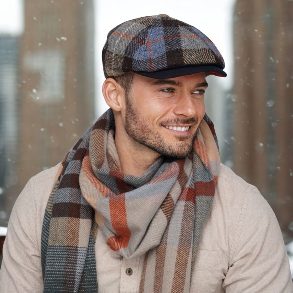 Zimní šála je velmi příjemná a heboučká, a díky speciální úpravě působí na dotek kašmírovým pocitem v béžovo-modrém kostkovaném vzoru s cihlovými akcenty.