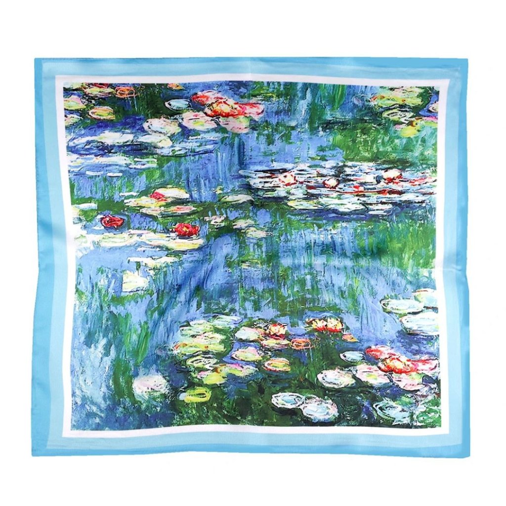 Vneste do svého outfitu nádech elegance s tímto stylovým šátkem o rozměrech 50 × 50 cm. Jeho jemný modro-zelený vzor s motivem leknínů působí svěže a vkusně, čímž se stává ideálním doplňkem pro každodenní nošení.