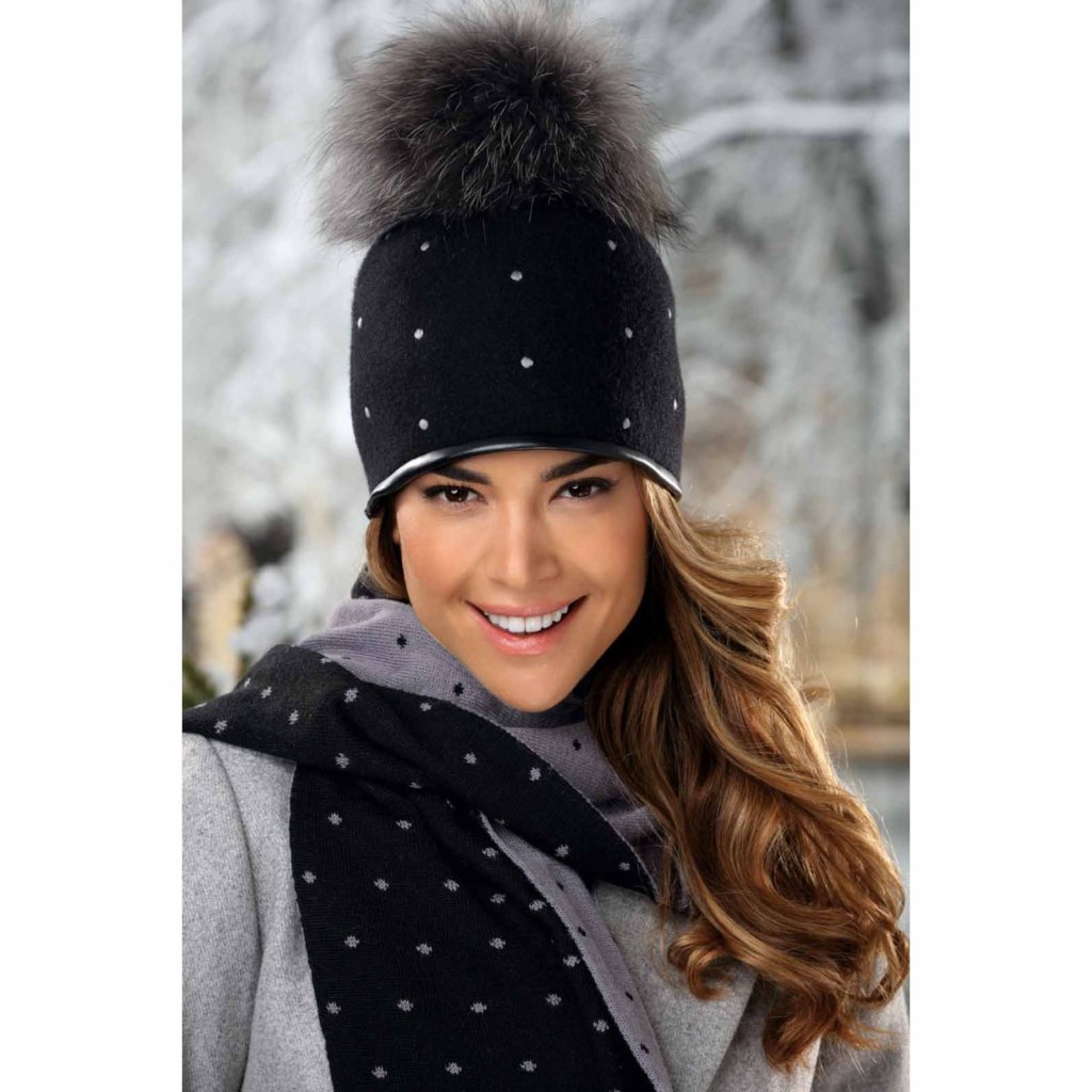 Zimní černá čepice a šál. Dámská černá čepice z hřejivé a měkké certifikované vlny Woolmark, kterou nabízíme v krásném kompletu s dvoubarevnou šálou 160x40cm. Vlněná čepice, která se dokonale přizpůsobí každé velikosti hlavy. Jedinečný charakter dodává dámské vlněné čepici hravá aplikace v podobě ručně vyšívaných puntíků. Celek čepice doplňuje přírodní kožešinová bambulka. Dámská čepice má nastavitelné šňůrky v lemu pro snadnou úpravu velikosti. Čepici nabízíme v několika krásných barevných variantách pod kódem W-0770.