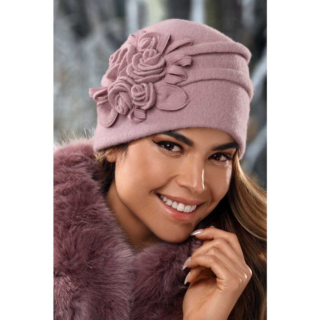 Elegantní dámská starorůžová zimní čepice z nejkvalitnější vlny s certifikátem Woolmark, která se dokonale přizpůsobí každé velikosti hlavy. Dámská čepice je ozdobena ručně tvořenou květinovou aplikací a má krásný propracovaný slušivý střih.